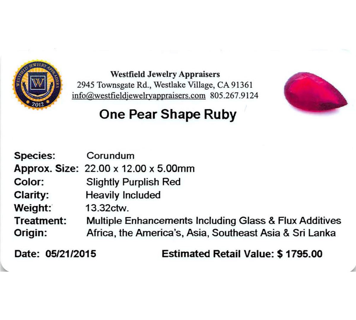 One pear mixed cut natural ruby, measuring 22.00 x 12.00 x 5.00mm, exact weight 13.32ct., clarity is heavily included, type II, medium dark, very slightly brownish, slightly purplish red color, (GIA slpR 6/3), cut is good. Transmitting light somewhat diffusely, transparent to translucent. Naturally occurring internal & external characteristics are present. Indications of laboratory high temperature heat treatment, with glass & flux additives. Ruby has a low tolerance to rhodium plating, repolishing the surface, & ultrasonic cleaning. Westfield Appraised at $1,795.00.