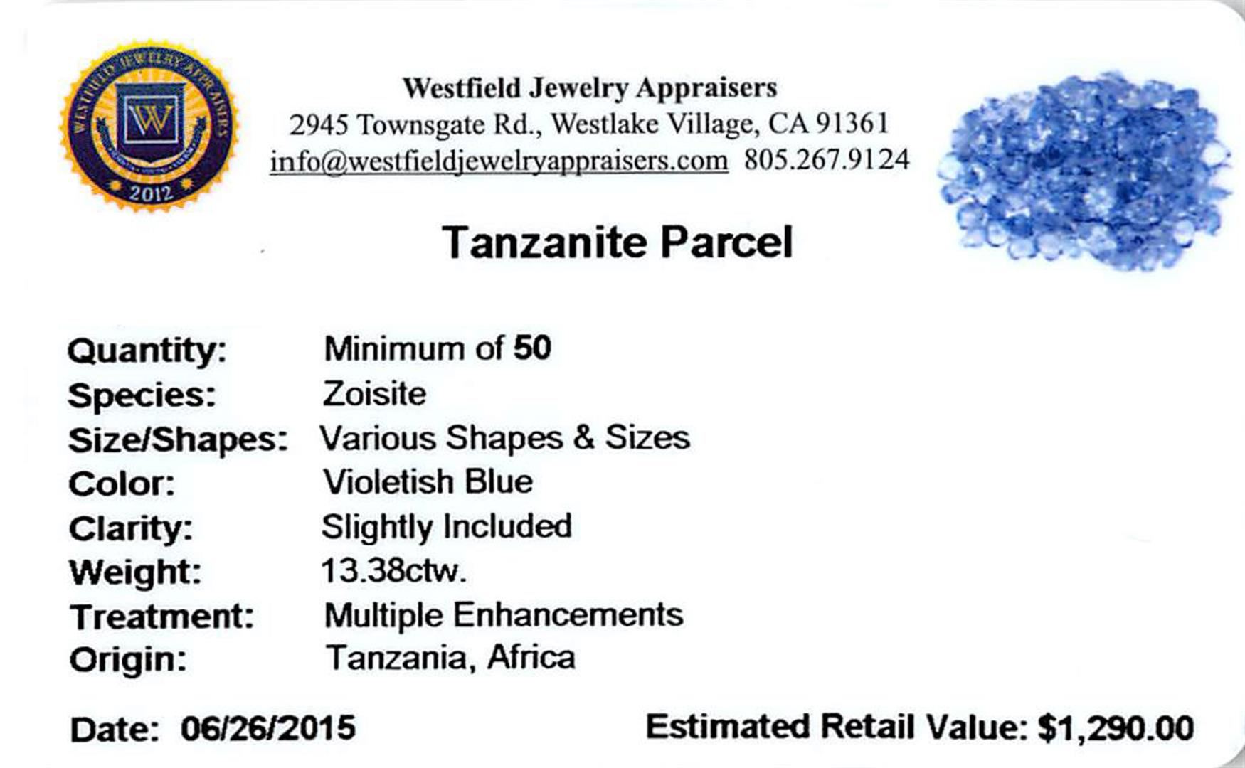 Fifty round mixed cut natural tanzanites, measuring 3.00 - 3.00 x 1.95 mm, exact total weight 13.38ct., clarity is slightly included, type I, medium, very slightly grayish, violetish blue color, (GIA vB 5/3), cut is good. Measurements & the color grade are an average for the group, Color grade is an average for the group, Transmitting light with no distortion, transparent, Naturally occurring internal & external characteristics are present, Indications of multiple laboratory enhancements, including high temperature heat treatment. Westfield Appraised at $1,290.00.