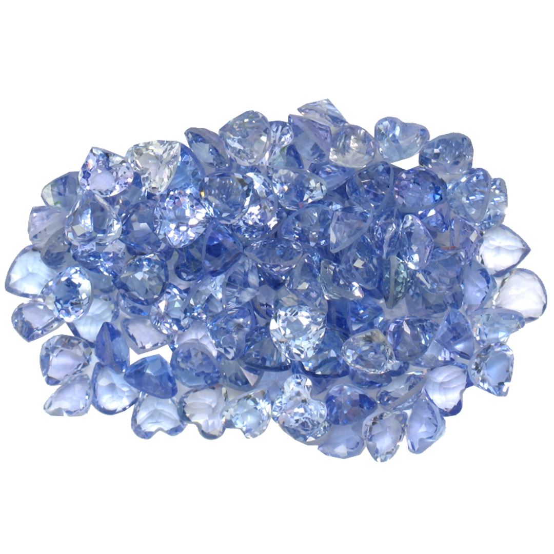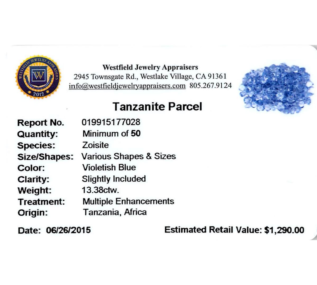 Fifty round mixed cut natural tanzanites, measuring 3.00 - 3.00 x 1.95 mm, exact total weight 13.38ct., clarity is slightly included, type I, medium, very slightly grayish, violetish blue color, (GIA vB 5/3), cut is good. Measurements & the color grade are an average for the group, Color grade is an average for the group, Transmitting light with no distortion, transparent, Naturally occurring internal & external characteristics are present, Indications of multiple laboratory enhancements, including high temperature heat treatment. Westfield Appraised at $1,290.00.