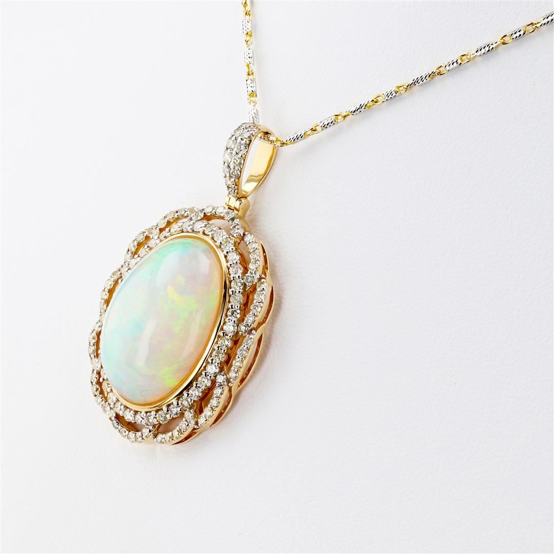 Fourteen karat (14K) two tone gold natural opal and diamond pendant. An oval cabochon cut natural opal gemstone is mounted in the center of the pendant. Round brilliant cut diamonds accent the pendant around the center gemstone. The pendant and chain have