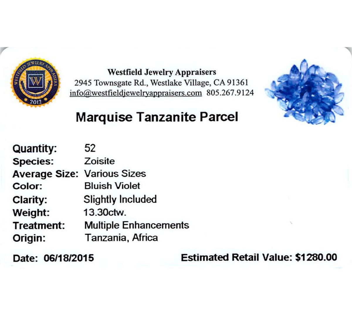 Fifty-two marquise mixed cut natural tanzanites exact total weight 13.30ct., clarity is slightly included, type I, medium dark, very slightly grayish, bluish violet color, (GIA bV 6/3), cut is good. Transmitting light with a minimum of distortion, transparent. Naturally occurring internal & external characteristics are present. Color grade is an average for the group. Tanzanite is a very rare gemstone that is only found in the country of Tanzania. Originally discovered in 1967. Tiffany & Company, named the stone Tanzanite. It is found in the Usumburu Mountains that border the Umba Valley of northern Tanzania. Tanzanite occurs in gray, brown, violet, blue, reddish-purple, & green. The gem is interesting because of its exceptional pleochroism. Rotated in different directions a tanzanite will exhibit multiple changes of color. Tanzanite has a low tolerance to ultrasonic cleaning, and should not be cleaned using this method. Westfield Appraised at $1,280.00.