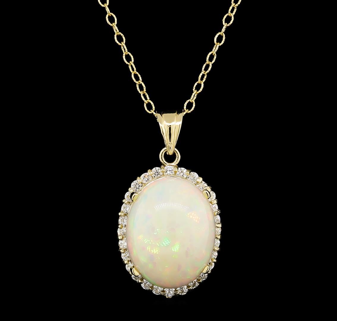 One electronically tested 14KT yellow gold lady's cast fashion pendant & chain 18.0' long, 1.9mm twisted oval shape link with a lobster claw clasp with a bright polish finish. Identified with markings of '14K'. Condition is new, good workmanship. Containing: One crystal opal that is cut in a cabochon shaped cabochon and is prong set, measuring 20.48 mm long x 16.11 mm wide, and 10.05 mm thick and the approximate weight is 13.41 carats. The opal has a somewhat bright, multicolor play of color (fire) in a rolling flashfire pattern; a high dome; a good cut; slightly included; slight variation in base in its brightness and pattern; and is not directional. Graded in the setting. Twenty-Eight prong set round brilliant cut diamonds, measuring 2.10 - 2.00 x 1.23mm (depth est.) approximate total weight of 28 Stones = 0.88ct. Graded in the setting. Clarity SI-1 to SI-2. Color: H - I Cut Good. Total Weight of Diamonds 0.88ct.. Total Weight of Opals 13.41ct.. Total Weight of Pendant & Chain 9.00gm. GAS Appraised at $8,810.00.
