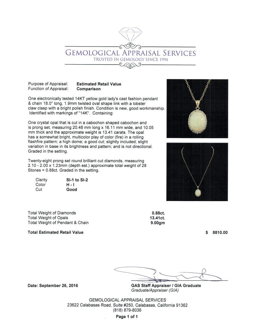 One electronically tested 14KT yellow gold lady's cast fashion pendant & chain 18.0' long, 1.9mm twisted oval shape link with a lobster claw clasp with a bright polish finish. Identified with markings of '14K'. Condition is new, good workmanship. Containing: One crystal opal that is cut in a cabochon shaped cabochon and is prong set, measuring 20.48 mm long x 16.11 mm wide, and 10.05 mm thick and the approximate weight is 13.41 carats. The opal has a somewhat bright, multicolor play of color (fire) in a rolling flashfire pattern; a high dome; a good cut; slightly included; slight variation in base in its brightness and pattern; and is not directional. Graded in the setting. Twenty-Eight prong set round brilliant cut diamonds, measuring 2.10 - 2.00 x 1.23mm (depth est.) approximate total weight of 28 Stones = 0.88ct. Graded in the setting. Clarity SI-1 to SI-2. Color: H - I Cut Good. Total Weight of Diamonds 0.88ct.. Total Weight of Opals 13.41ct.. Total Weight of Pendant & Chain 9.00gm. GAS Appraised at $8,810.00.