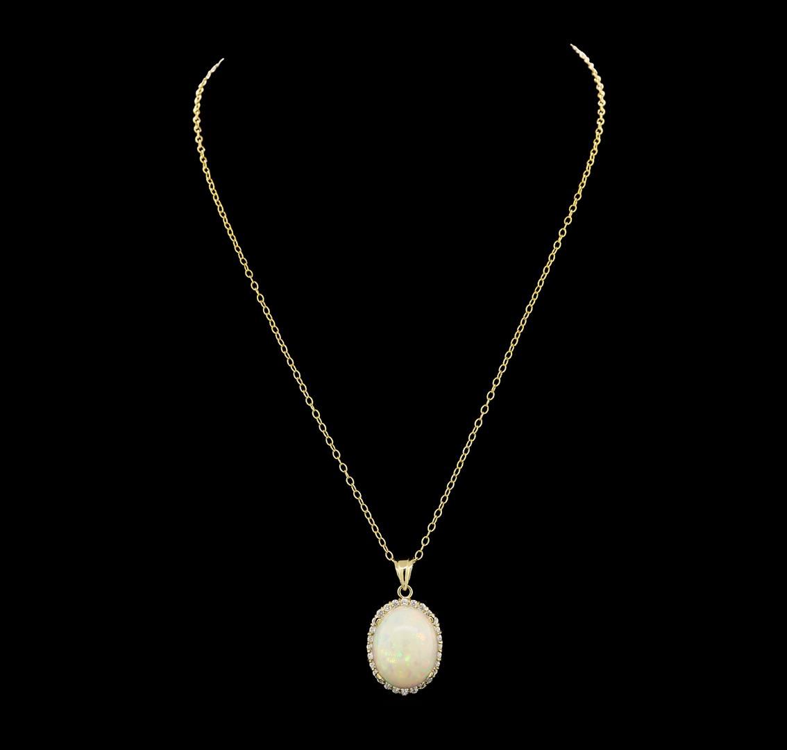 One electronically tested 14KT yellow gold lady's cast fashion pendant & chain 18.0' long, 1.9mm twisted oval shape link with a lobster claw clasp with a bright polish finish. Identified with markings of '14K'. Condition is new, good workmanship. Containing: One crystal opal that is cut in a cabochon shaped cabochon and is prong set, measuring 20.48 mm long x 16.11 mm wide, and 10.05 mm thick and the approximate weight is 13.41 carats. The opal has a somewhat bright, multicolor play of color (fire) in a rolling flashfire pattern; a high dome; a good cut; slightly included; slight variation in base in its brightness and pattern; and is not directional. Graded in the setting. Twenty-Eight prong set round brilliant cut diamonds, measuring 2.10 - 2.00 x 1.23mm (depth est.) approximate total weight of 28 Stones = 0.88ct. Graded in the setting. Clarity SI-1 to SI-2. Color: H - I Cut Good. Total Weight of Diamonds 0.88ct.. Total Weight of Opals 13.41ct.. Total Weight of Pendant & Chain 9.00gm. GAS Appraised at $8,810.00.