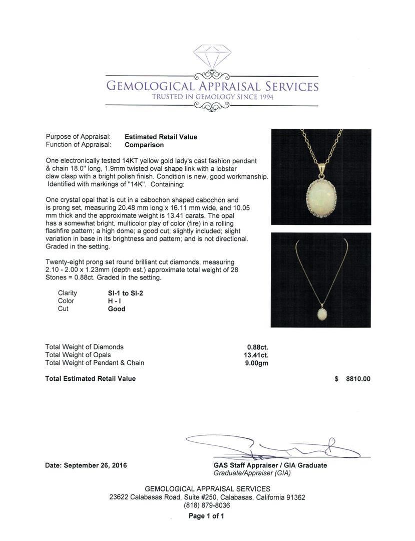 One electronically tested 14KT yellow gold lady's cast fashion pendant & chain 18.0' long, 1.9mm twisted oval shape link with a lobster claw clasp with a bright polish finish. Identified with markings of '14K'. Condition is new, good workmanship. Containing: One crystal opal that is cut in a cabochon shaped cabochon and is prong set, measuring 20.48 mm long x 16.11 mm wide, and 10.05 mm thick and the approximate weight is 13.41 carats. The opal has a somewhat bright, multicolor play of color (fire) in a rolling flashfire pattern; a high dome; a good cut; slightly included; slight variation in base in its brightness and pattern; and is not directional. Graded in the setting. Twenty-Eight prong set round brilliant cut diamonds, measuring 2.10 - 2.00 x 1.23mm (depth est.) approximate total weight of 28 Stones = 0.88ct. Graded in the setting. Clarity SI-1 to SI-2. Color: H - I Cut Good. Total Weight of Diamonds 0.88ct.. Total Weight of Opals 13.41ct.. Total Weight of Pendant & Chain 9.00gm. GAS Appraised.