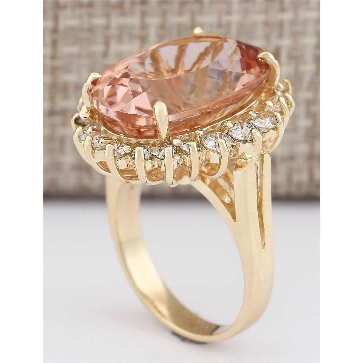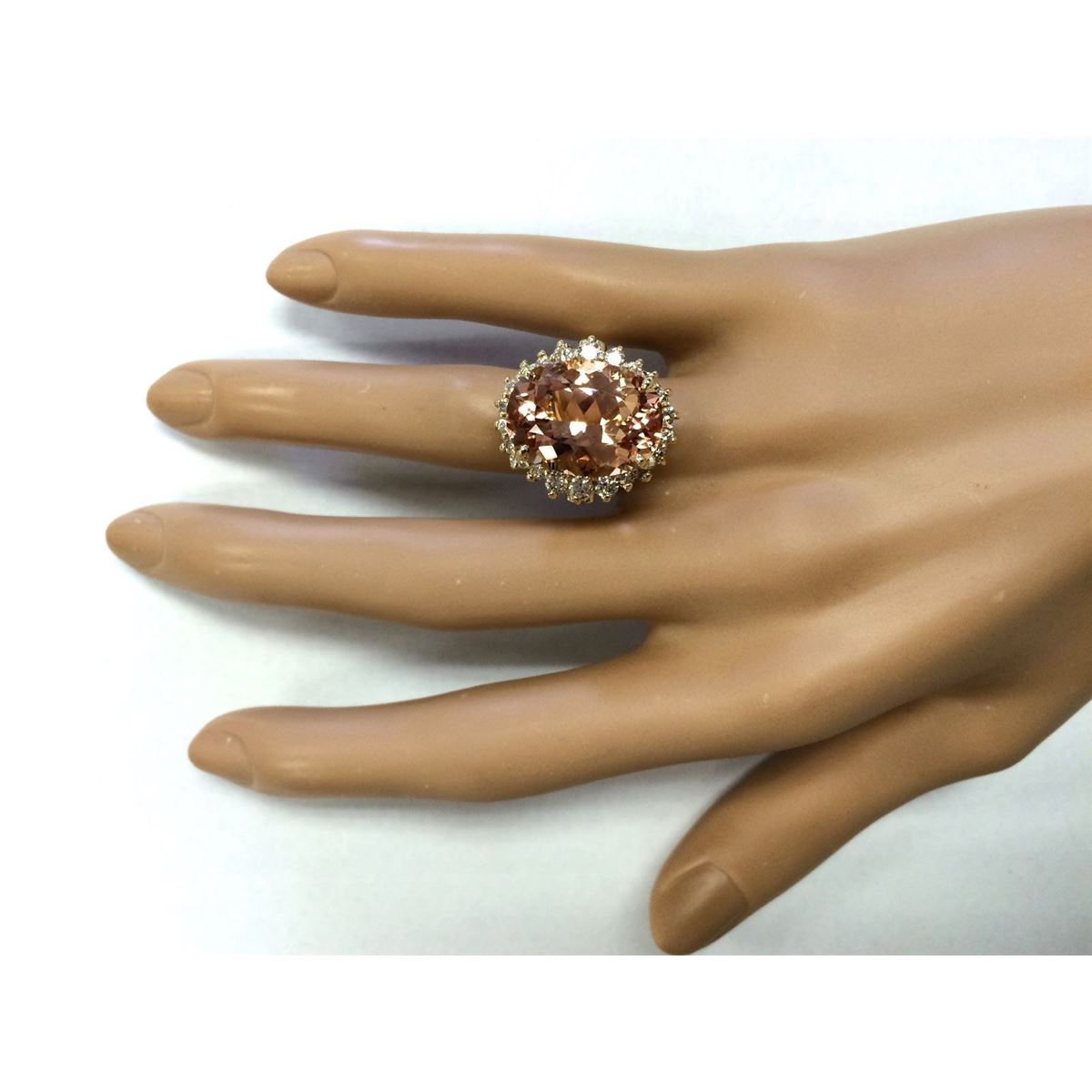 Stamped: 14K Ring Size: 6 Total Ring Weight: 10 Grams Diamond Weight: Total natural diamond weight is 1.05carat. SI1-SI2 clarity / G-H color Gemstone Weight: Total Natural Peach Morganite Weight is 12.38ctw (Measures: 17.92x13.09mm) Main Stone Color: Peach Face Measures: 22.00x19.77mm SKU: [703535]