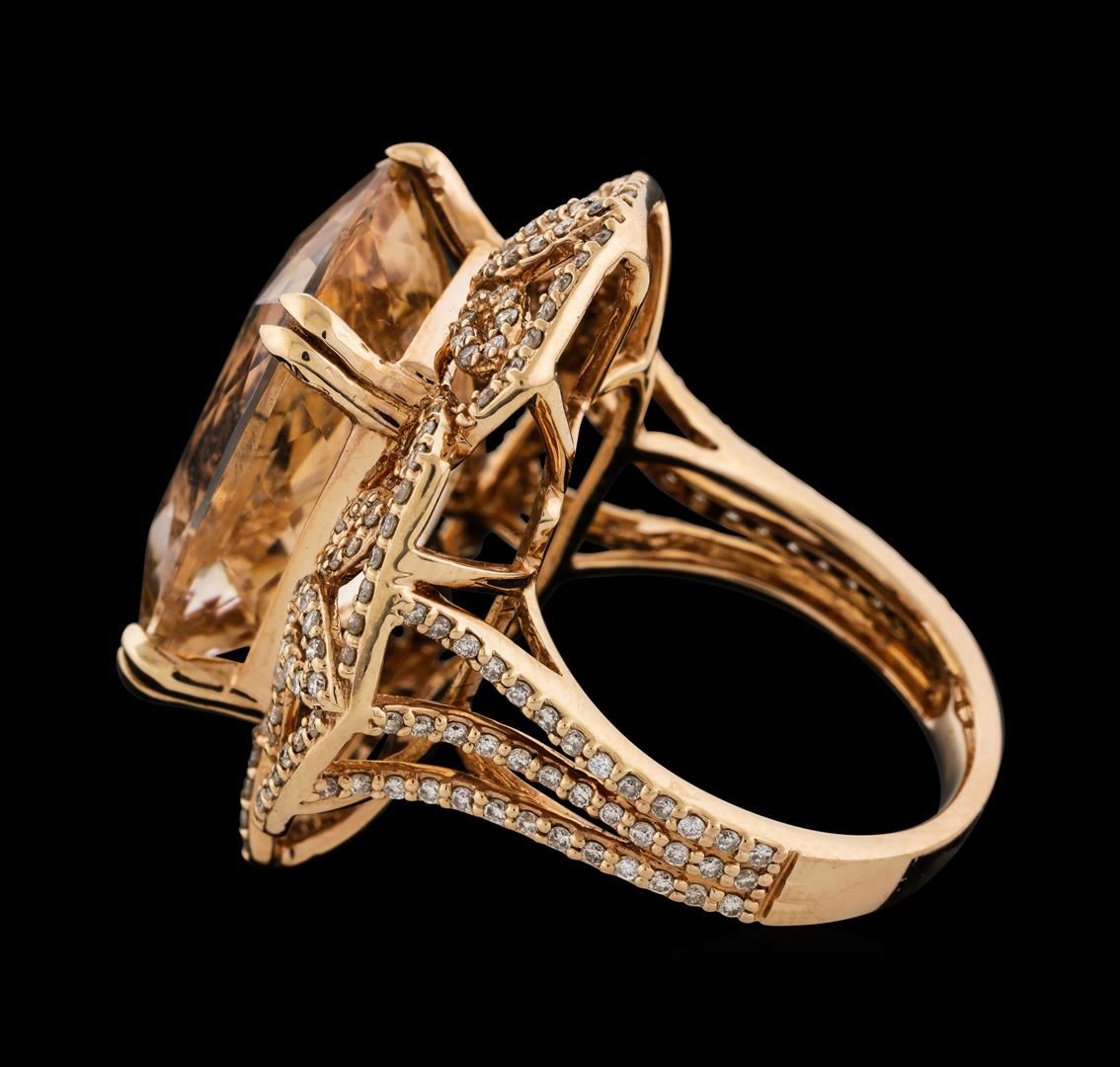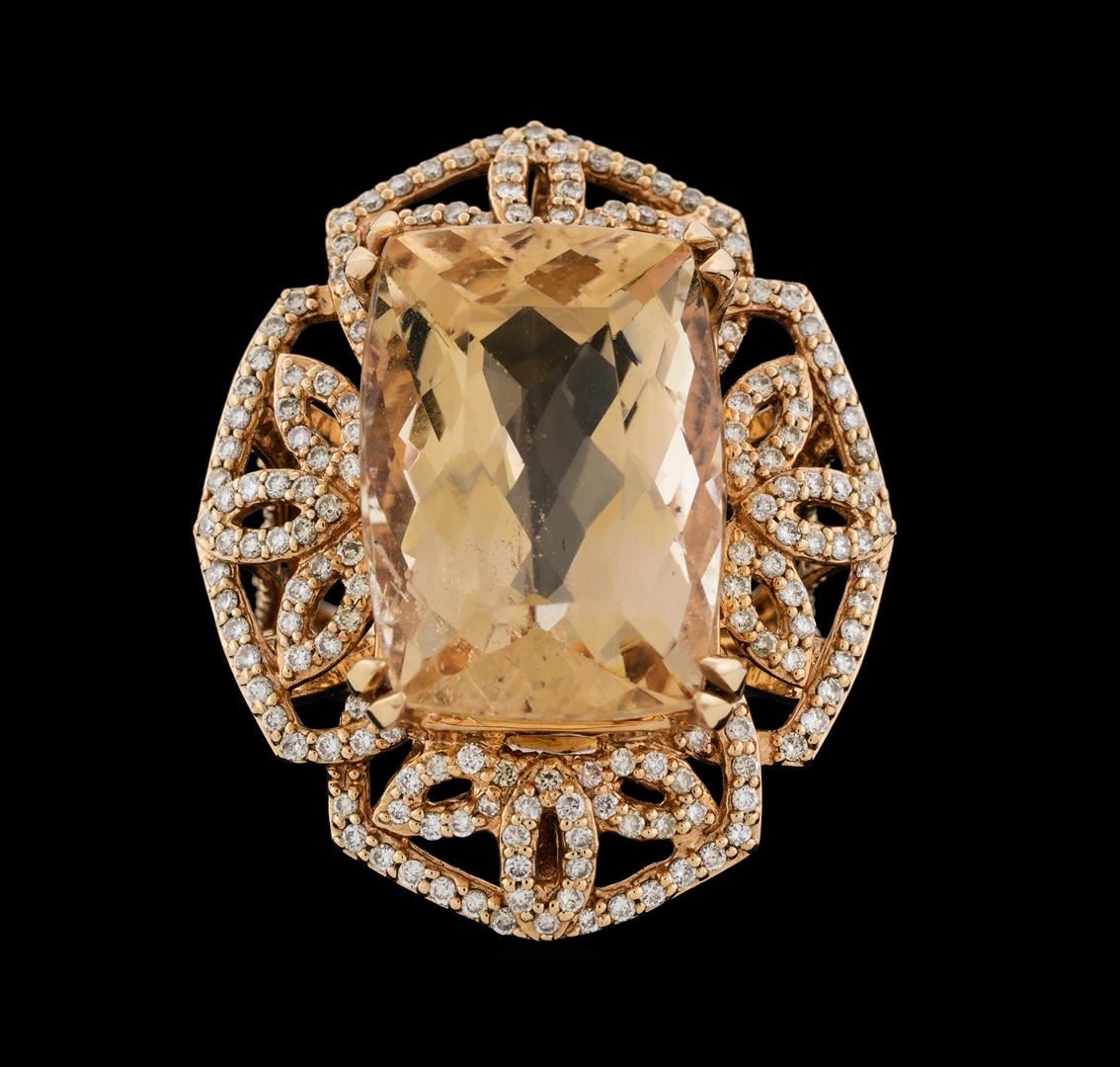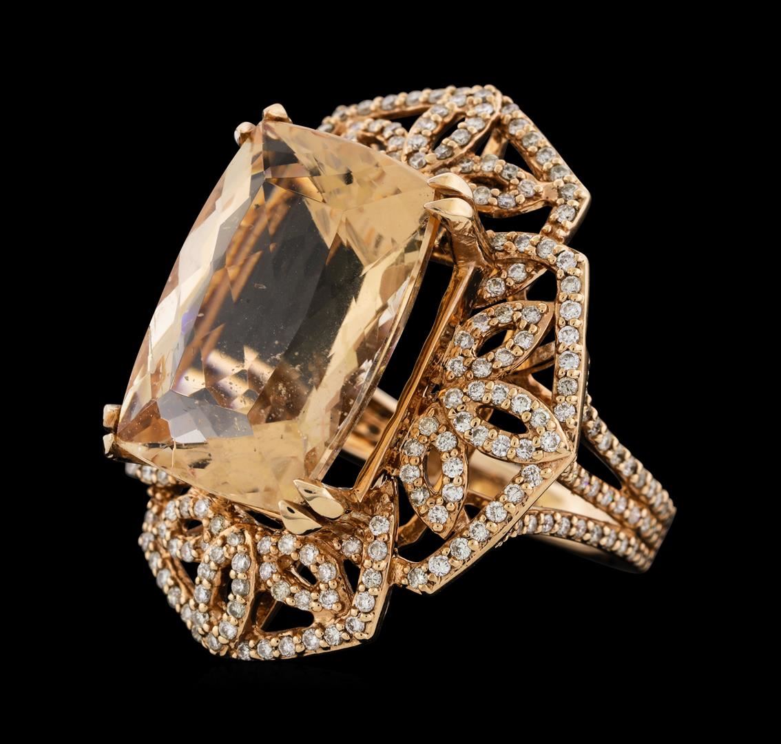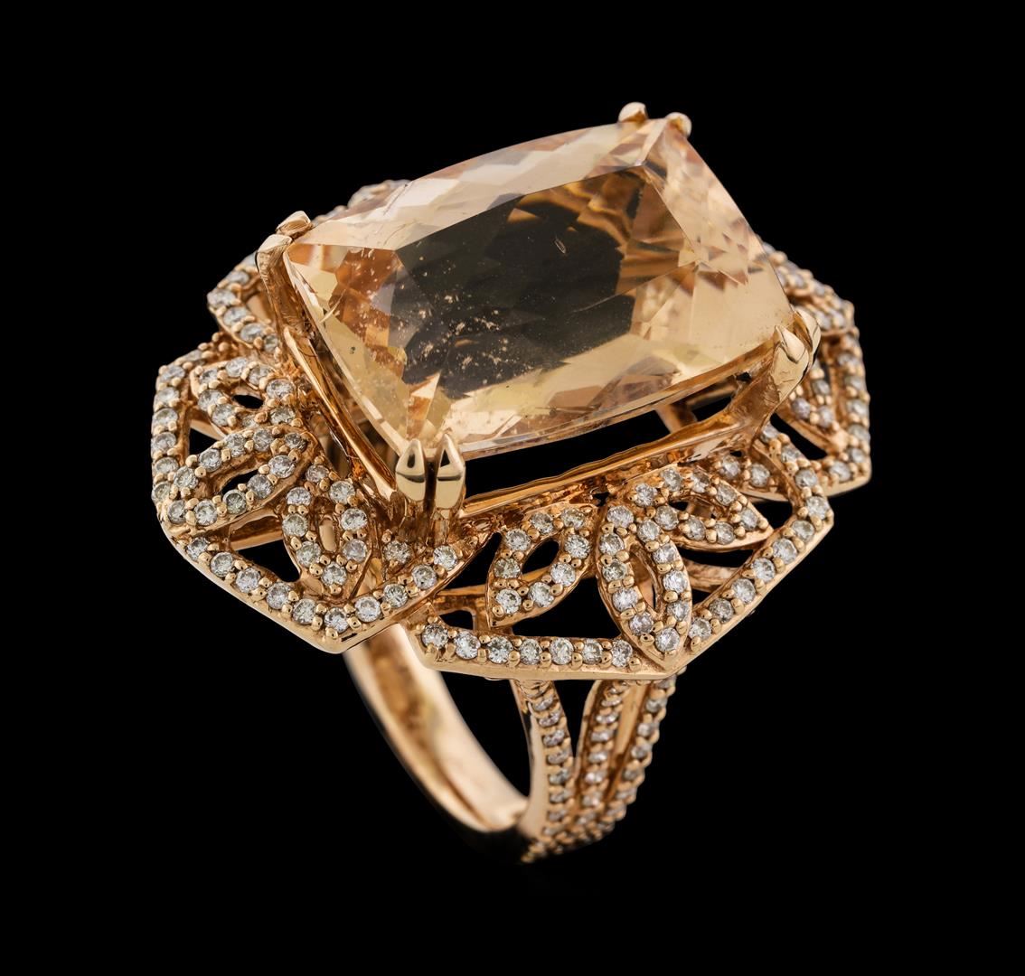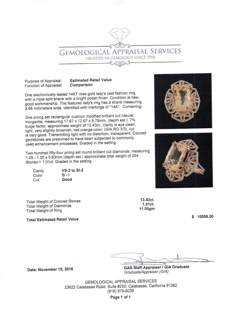 One electronically tested 14KT rose gold lady's cast fashion ring with a triple split shank with a bright polish finish. The featured lady's ring has a shank measuring 2.98 millimeters wide. Identified with markings of '14K'. Condition is new, good workmanship. Containing: One prong set rectangular cushion modified brilliant cut natural morganite, measuring 17.67 x 12.67 x 8.79mm, (depth est.) 7%. bulge factor, approximate weight of 13.43ct., clarity is eye clean, light, very slightly brownish, red orange color, (GIA RO 3/3), cut is very good. Transmitting light with no distortion, transparent. Colored gemstones are presumed to have been subjected to commonly used enhancement processes. Graded in the setting. Two Hundred Fifty-Four prong set round brilliant cut diamonds, measuring 1.05 - 1.00 x 0.63mm (depth est.) approximate total weight of 254 Stones = 1.01ct. Graded in the setting. Clarity VS-2 to SI-2. Color: G - I Cut Good. Total Weight of Colored Stones 13.43ct.. Total Weight of Diamonds 1.01ct.. Total Weight of Ring 11.00gm. GAS Appraised at $10,055.00.