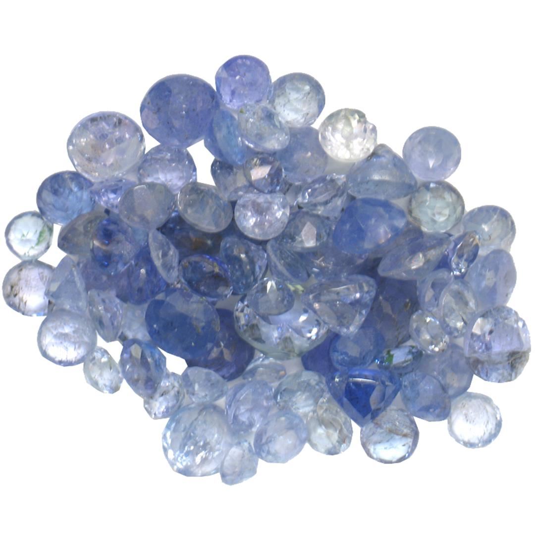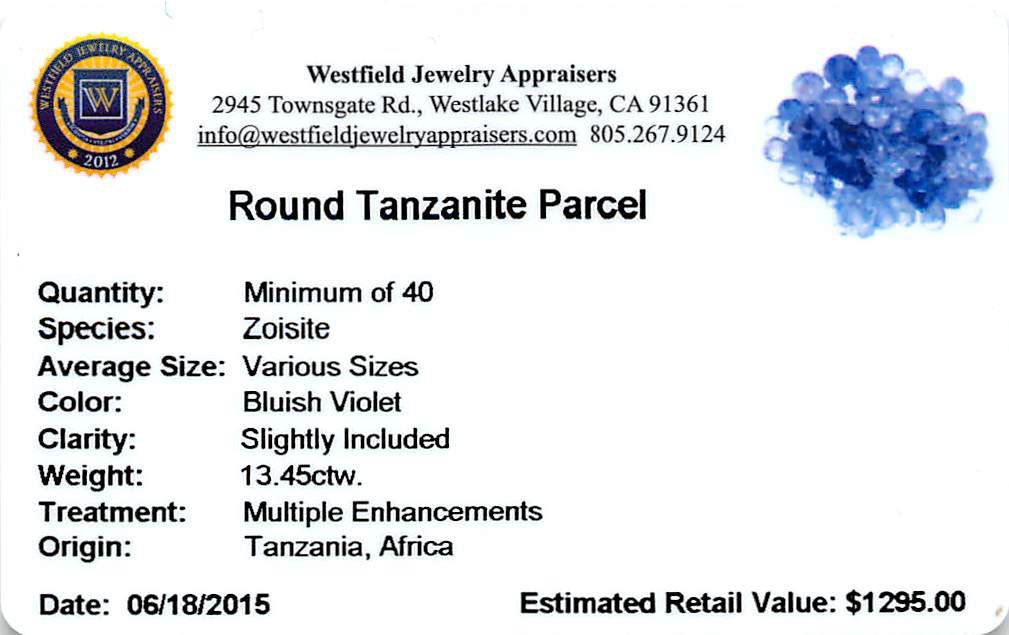 Forty round mixed cut natural tanzanites exact total weight 13.45ct., clarity is slightly included, type I, medium dark, very slightly grayish, bluish violet color, (GIA bV 6/3), cut is good. Transmitting light with a minimum of distortion, transparent. Naturally occurring internal & external characteristics are present. Color grade is an average for the group. Tanzanite is a very rare gemstone that is only found in the country of Tanzania. Originally discovered in 1967. Tiffany & Company, named the stone Tanzanite. It is found in the Usumburu Mountains that border the Umba Valley of northern Tanzania. Tanzanite occurs in gray, brown, violet, blue, reddish-purple, & green. The gem is interesting because of its exceptional pleochroism. Rotated in different directions a tanzanite will exhibit multiple changes of color. Tanzanite has a low tolerance to ultrasonic cleaning, and should not be cleaned using this method. Westfield Appraised at $1,295.00.