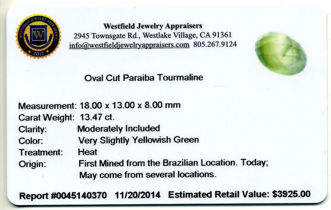 13.47ctw. Oval Cut Paraiba Tourmaline. Westfield Appraised at $3,925.00.