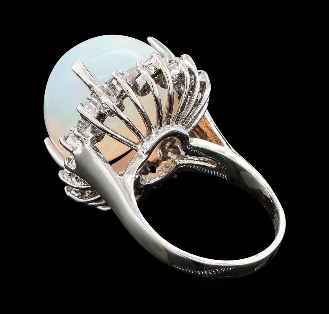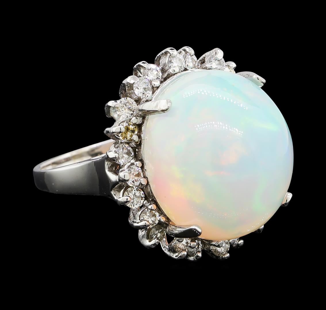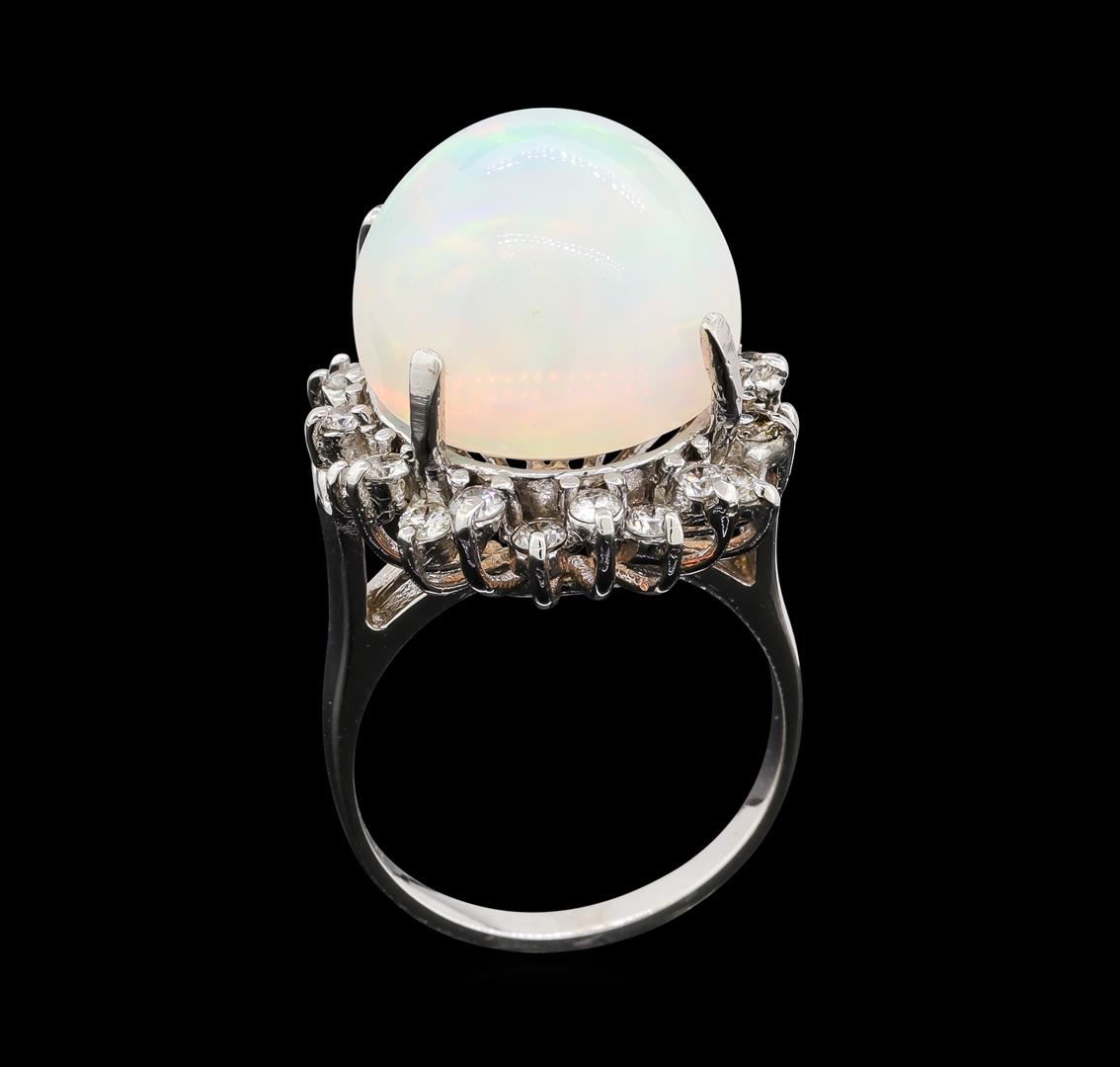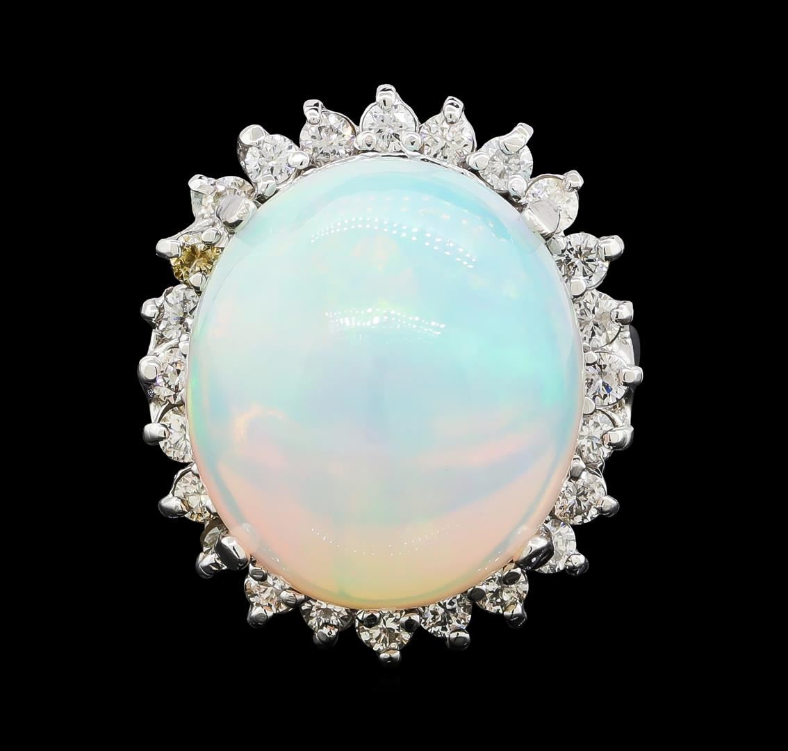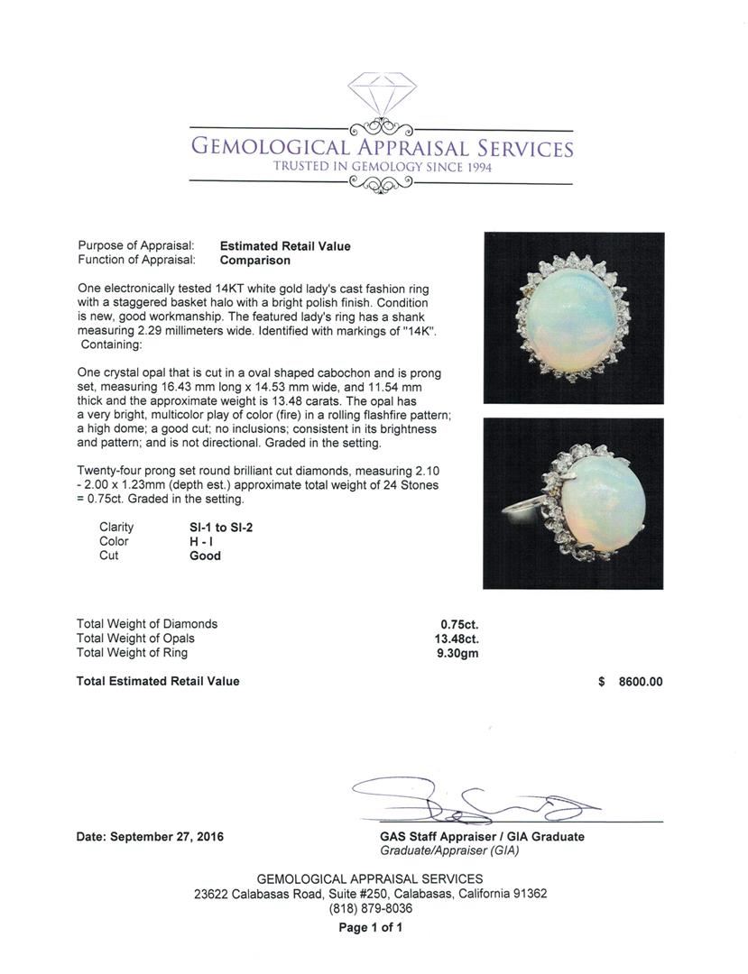 One electronically tested 14KT white gold lady's cast fashion ring with a staggered basket halo with a bright polish finish. The featured lady's ring has a shank measuring 2.29 millimeters wide. Identified with markings of '14K'. Condition is new, good workmanship. Containing: One crystal opal that is cut in a oval shaped cabochon and is prong set, measuring 16.43 mm long x 14.53 mm wide, and 11.54 mm thick and the approximate weight is 13.48 carats. The opal has a very bright, multicolor play of color (fire) in a rolling flashfire pattern; a high dome; a good cut; no inclusions; consistent in its brightness and pattern; and is not directional. Graded in the setting. Twenty-Four prong set round brilliant cut diamonds, measuring 2.10 - 2.00 x 1.23mm (depth est.) approximate total weight of 24 Stones = 0.75ct. Graded in the setting. Clarity SI-1 to SI-2. Color: H - I Cut Good. Total Weight of Diamonds 0.75ct.. Total Weight of Opals 13.48ct.. Total Weight of Ring 9.30gm. GAS Appraised at $8,600.00.