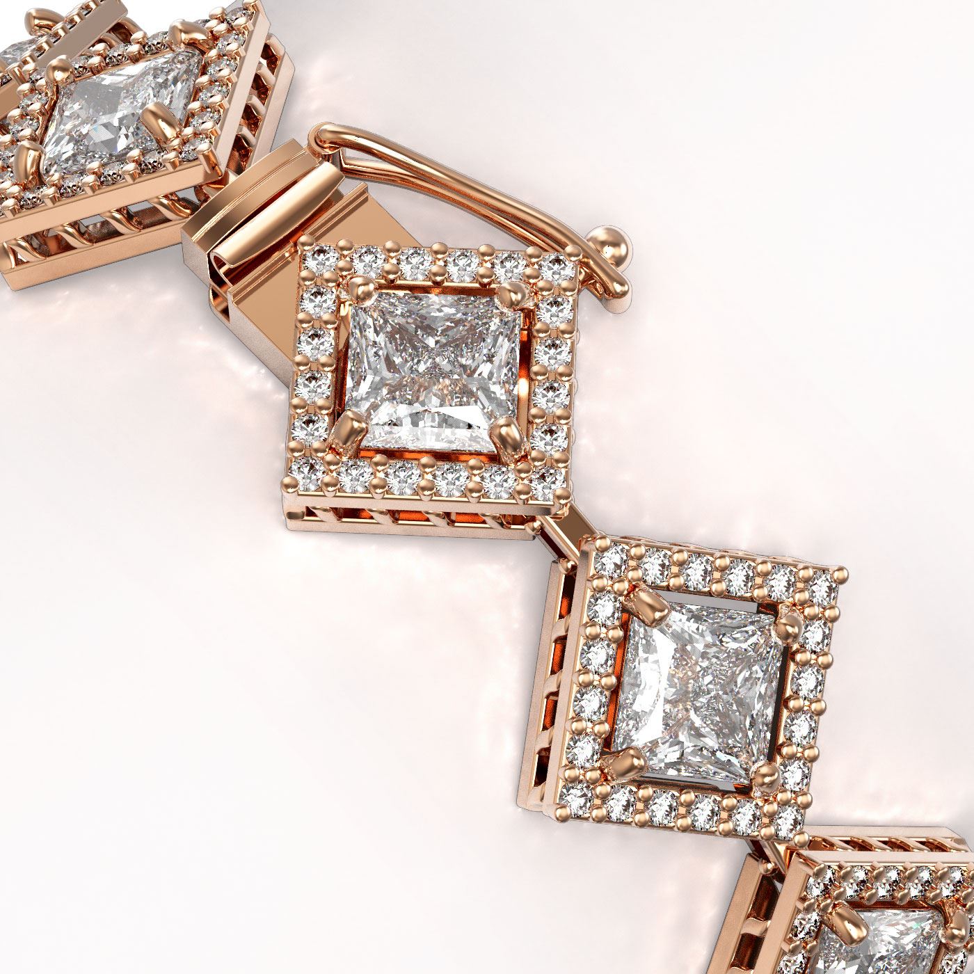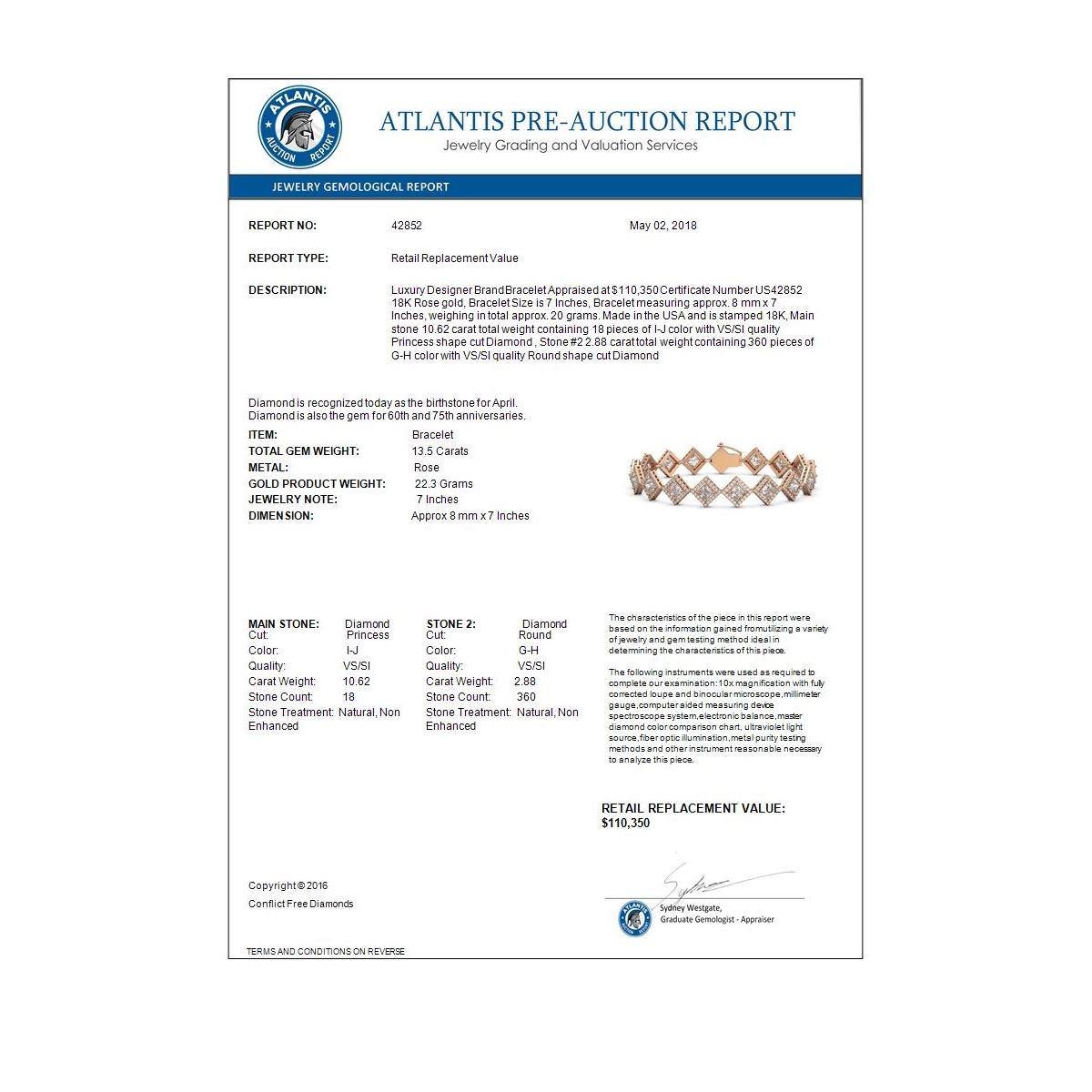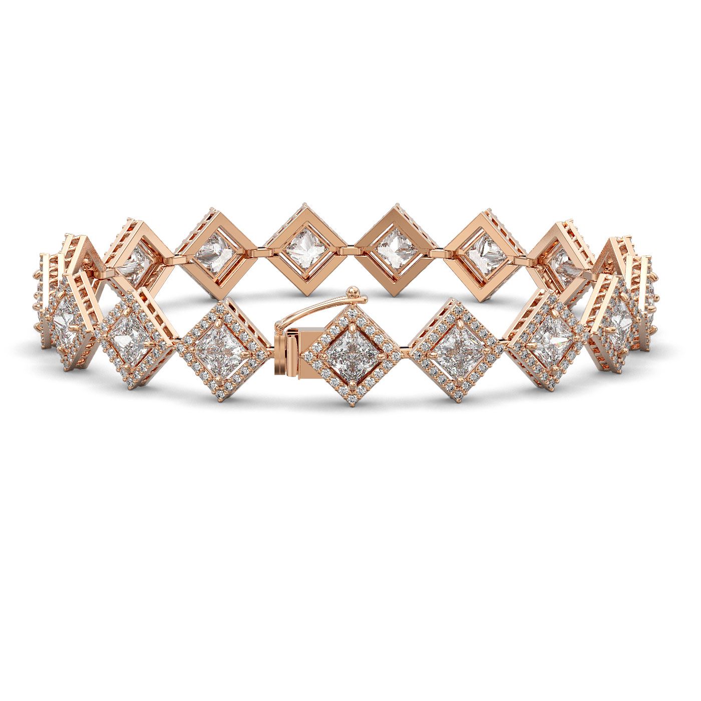 REF-2508F4N -42852 ---- 13.5 CTW Princess Cut Diamond Designer Bracelet 18K Rose Gold ---- Luxury Designer Brand Bracelet Appraised at $110,350 Certificate Number US42852 18K Rose gold, Bracelet Size is 7 Inches, Bracelet measuring approx. 8 mm x 7 Inches, weighing in total approx. 20 grams. Made in the USA and is stamped 18K, Main stone 10.62 carat total weight containing 18 pieces of I-J color with VS/SI quality Princess shape cut Diamond , Stone #2 2.88 carat total weight containing 360 pieces of G-H color with VS/SI quality Round shape cut Diamond