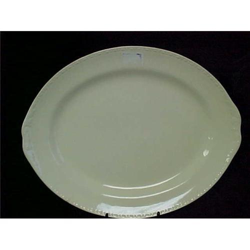 13.5" Homer Laughlin Platter. Georgian in Eggshell J43N6. Chip out of rim, otherwise in good condition. Some scratches-obviously used and loved!