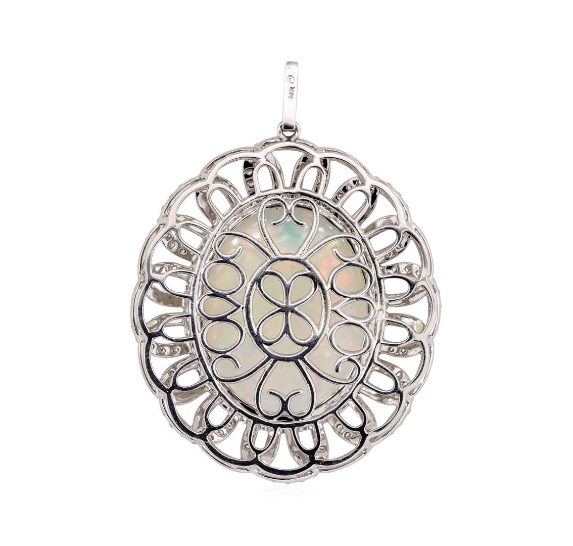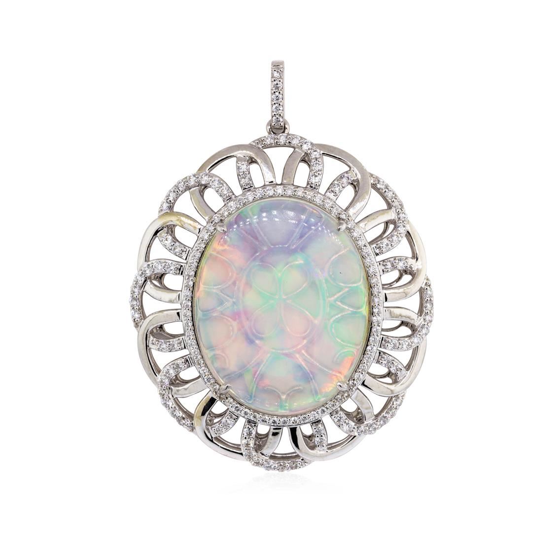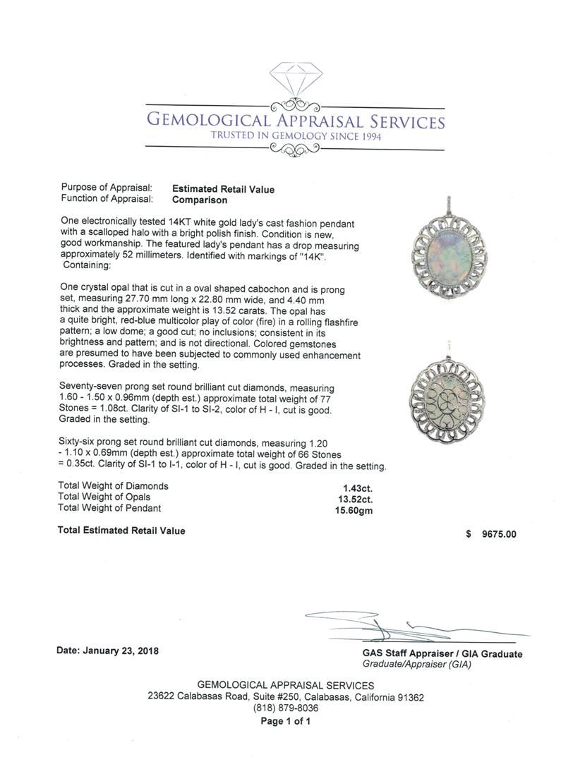 One electronically tested 14KT white gold lady's cast fashion pendant with a scalloped halo with a bright polish finish. The featured lady's pendant has a drop measuring approximately 52 millimeters. Identified with markings of '14K'. Condition is new, good workmanship. Containing: One crystal opal that is cut in a oval shaped cabochon and is prong set, measuring 27.70 mm long x 22.80 mm wide, and 4.40 mm thick and the approximate weight is 13.52 carats. The opal has a quite bright, red-blue multicolor play of color (fire) in a rolling flashfire pattern; a low dome; a good cut; no inclusions; consistent in its brightness and pattern; and is not directional. Colored gemstones are presumed to have been subjected to commonly used enhancement processes. Graded in the setting. Seventy-Seven prong set round brilliant cut diamonds, measuring 1.60 - 1.50 x 0.96mm (depth est.) approximate total weight of 77 Stones = 1.08ct. Graded in the setting. Color H - I Clarity SI-1 to SI-2 Cut Good Sixty-Six prong set round brilliant cut diamonds, measuring 1.20 - 1.10 x 0.69mm (depth est.) approximate total weight of 66 Stones = 0.35ct. Graded in the setting. Color H - I Clarity SI-1 to I-1 Cut Good. Total Weight of Diamonds 1.43ct.. Total Weight of Opals 13.52ct.. Total Weight of Pendant 15.60gm GAS Appraised at $9675.00. GAS Appraised at $9,675.00.