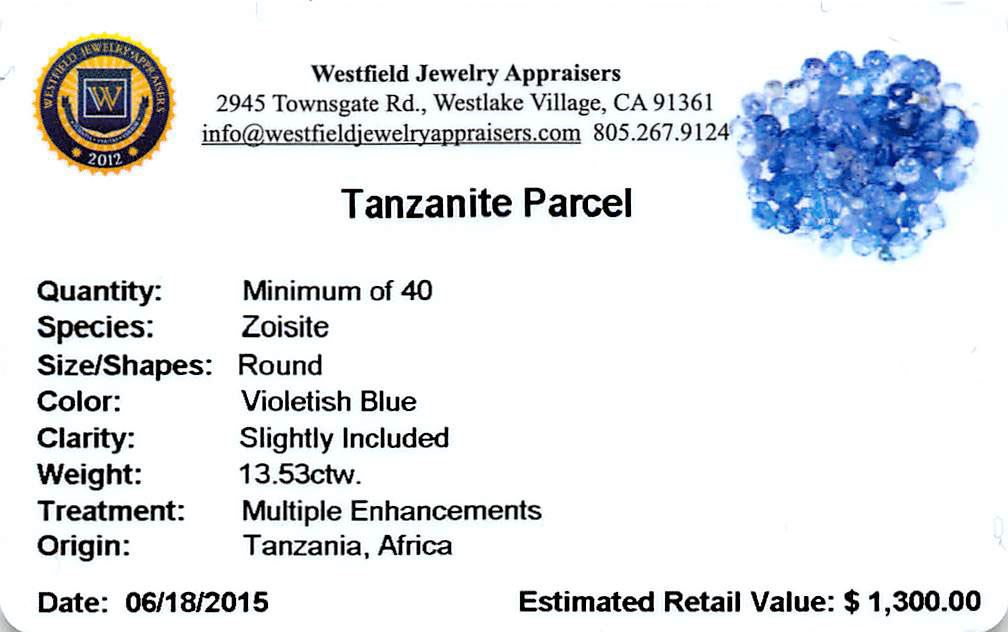 Forty round mixed cut natural tanzanites exact total weight 13.53ct., clarity is slightly included, type I, medium dark, slightly grayish, violetish blue color, (GIA vB 6/2), cut is good. Measurements & the color grade are an average for the group, Color grade is an average for the group, Naturally occurring internal & external characteristics are present, Indications of laboratory high temperature heat treatment. Westfield Appraised at $1,300.00.
