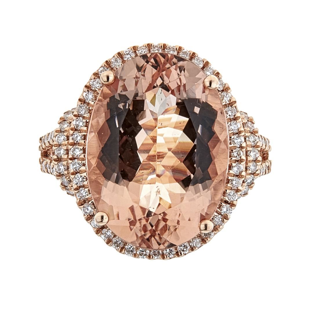 One lady's morganite and diamond ring. Setting: 14KT rose gold mounting. Additional: 82 round diamonds = 0.55cts. TWT (G-H/SI-I1). Center gem stone information; species: natural beryl. Variety: morganite. Shape and cut: oval mixed cut. Measurements: 18.11 x 13.09 x 8.94mm. Weight: 13.54 carats. Transparency: Transparent. Color hue: pink. Saturation: moderate. Total Weight: 7.6 grams.