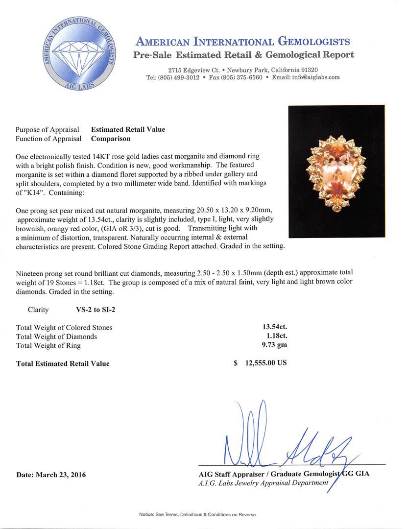 One electronically tested 14KT rose gold ladies cast morganite and diamond ring with a bright polish finish. The featured morganite is set within a diamond floret supported by a ribbed under gallery and split shoulders, completed by a two millimeter wide band. Identified with markings of "K14". Condition is new, good workmanship. Containing: One prong set pear mixed cut natural morganite, measuring 20.50 x 13.20 x 9.20mm, approximate weight of 13.54ct., clarity is slightly included, type I, light, very slightly brownish, orangy red color, (GIA oR 3/3), cut is good. Transmitting light with a minimum of distortion, transparent. Naturally occurring internal & external characteristics are present. Colored Stone Grading Report attached. Graded in the setting. Nineteen prong set round brilliant cut diamonds, measuring 2.50 - 2.50 x 1.50mm (depth est.) approximate total weight of 19 Stones = 1.18ct. The group is composed of a mix of natural faint, very light and light brown color diamonds. Graded in the setting. Clarity: VS-2 to SI-2. Total Weight of Colored Stones 13.54ct. Total Weight of Diamonds 1.18ct. Total Weight of Ring 9.73gm. AIG Appraised at $12,555.00.