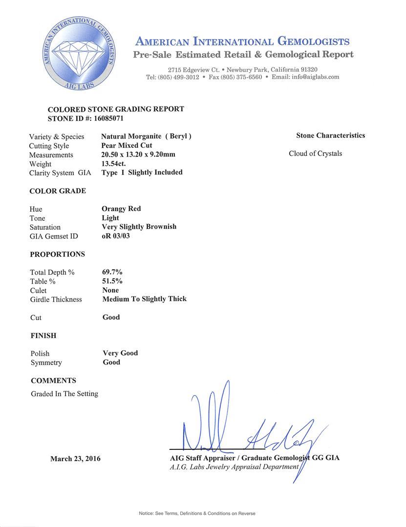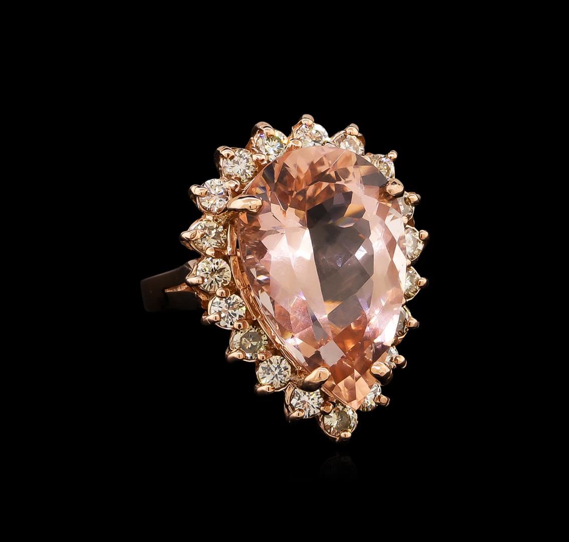 One electronically tested 14KT rose gold ladies cast morganite and diamond ring with a bright polish finish. The featured morganite is set within a diamond floret supported by a ribbed under gallery and split shoulders, completed by a two millimeter wide band. Identified with markings of "K14". Condition is new, good workmanship. Containing: One prong set pear mixed cut natural morganite, measuring 20.50 x 13.20 x 9.20mm, approximate weight of 13.54ct., clarity is slightly included, type I, light, very slightly brownish, orangy red color, (GIA oR 3/3), cut is good. Transmitting light with a minimum of distortion, transparent. Naturally occurring internal & external characteristics are present. Colored Stone Grading Report attached. Graded in the setting. Nineteen prong set round brilliant cut diamonds, measuring 2.50 - 2.50 x 1.50mm (depth est.) approximate total weight of 19 Stones = 1.18ct. The group is composed of a mix of natural faint, very light and light brown color diamonds. Graded in the setting. Clarity: VS-2 to SI-2. Total Weight of Colored Stones 13.54ct. Total Weight of Diamonds 1.18ct. Total Weight of Ring 9.73gm. AIG Appraised at $12,555.00.