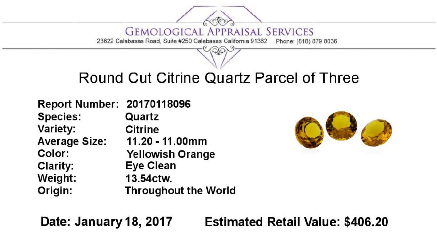 One natural round cut citrine quartz parcel of three with an exact weight of 13.54ctw., clarity is eye clean, yellowish orange. Gemological Appraisals Services estimates the retail value at $406.2 GAS Appraised.