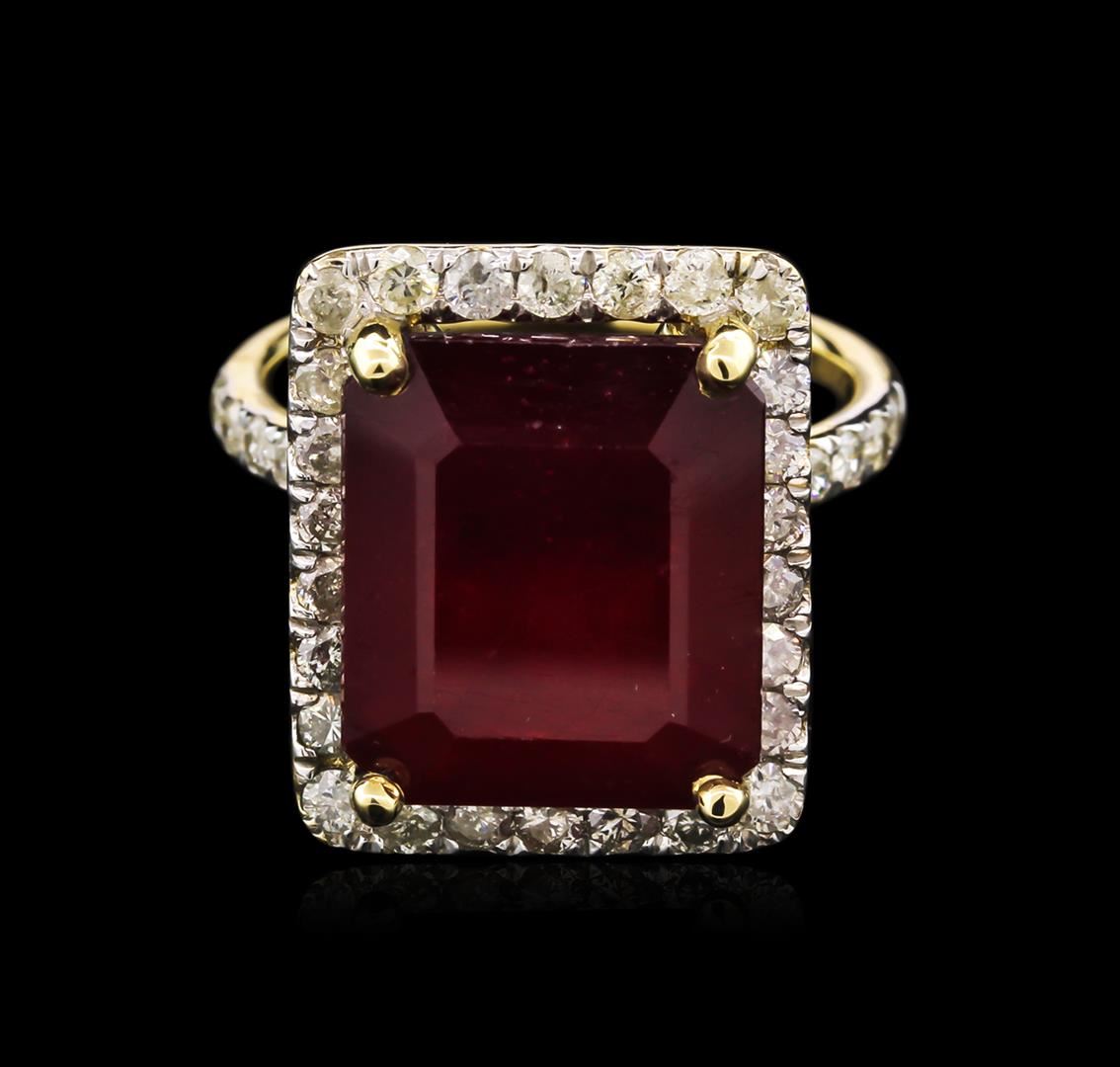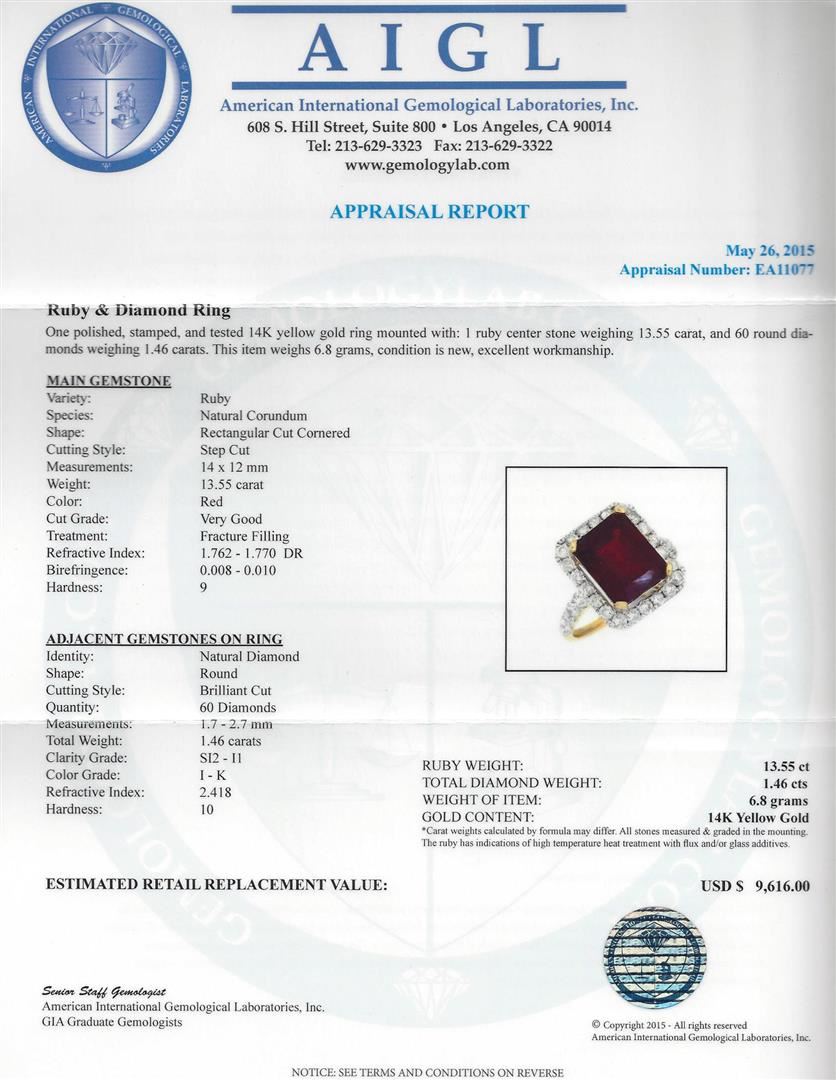 One polished, stamped, and tested 14K yellow gold ring mounted with: 1 ruby center stone weighing 13.55 carats, and 60 round diamonds weighing 1.46 carats. This item weighs 6.8 grams, condition is new, excellent workmanship. Main Gemstone: Variety: Ruby. Species: Natural Corundum. Shape: Rectangular Cut Cornered. Cutting Style: Step Cut. Measurements: 14 x 12 mm. Weight: 13.55 carat. Color: Red. Cut Grade: Very Good. Treatment: Fracture Filling. Refractive Index: 1.762 - 1.770 DR. Birefringence: 0.0078 - 0.010. Hardness: 9. Adjacent Gemstones On Ring: Identity: Natural Diamond. Shape: Round. Cutting Style: Brilliant Cut. Quantity: 60 Diamonds. Measurements: 1.7 - 2.7 mm. Total Weight: 1.46 carats. Clarity Grade: SI2 - II. Color Grade: I - K. Refractive Index: 2.418. Hardness: 10. Ruby Weight: 13.55ct. Total Diamond Weight: 1.46cts. Weight of Item 6.8 grams. Gold Content: 14K Yellow Gold. AIGL Appraised at $9,616.00.