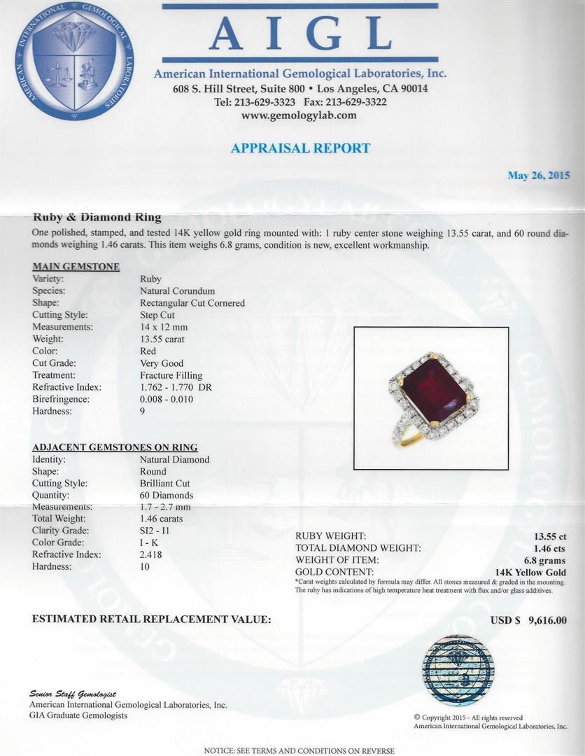One polished, stamped, and tested 14K yellow gold ring mounted with: 1 ruby center stone weighing 13.55 carats, and 60 round diamonds weighing 1.46 carats. This item weighs 6.8 grams, condition is new, excellent workmanship. Main Gemstone: Variety: Ruby. Species: Natural Corundum. Shape: Rectangular Cut Cornered. Cutting Style: Step Cut. Measurements: 14 x 12 mm. Weight: 13.55 carat. Color: Red. Cut Grade: Very Good. Treatment: Fracture Filling. Refractive Index: 1.762 - 1.770 DR. Birefringence: 0.0078 - 0.010. Hardness: 9. Adjacent Gemstones On Ring: Identity: Natural Diamond. Shape: Round. Cutting Style: Brilliant Cut. Quantity: 60 Diamonds. Measurements: 1.7 - 2.7 mm. Total Weight: 1.46 carats. Clarity Grade: SI2 - II. Color Grade: I - K. Refractive Index: 2.418. Hardness: 10. Ruby Weight: 13.55ct. Total Diamond Weight: 1.46cts. Weight of Item 6.8 grams. Gold Content: 14K Yellow Gold. AIGL Appraised at $9,616.00.