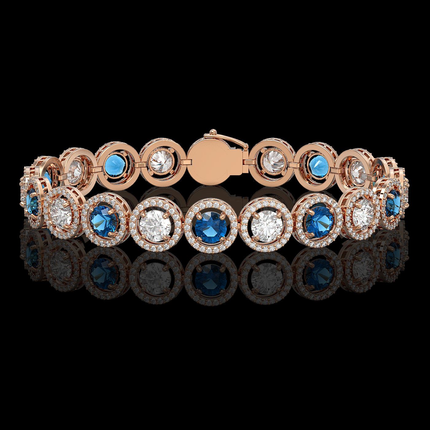 REF-3235T5M -42591 ---- 13.56 CTW Blue & White Diamond Designer Bracelet 18K Rose Gold ---- Luxury Designer Brand Bracelet Appraised at $142,350 Certificate Number US42591 18K Rose gold, Bracelet Size is 7 Inches, Bracelet measuring approx. 9 mm x 7 Inches, weighing in total approx. 22 grams. Made in the USA and is stamped 18K, Main stone 5.1 carat total weight containing 10 pieces of I-J color with VS/SI quality Round shape cut Diamond , Stone #2 5.1 carat total weight containing 10 pieces of Intense Blue color with SI/I quality Round shape cut Diamond , Stone #3 3.36 carat total weight containing 420 pieces of G-H color with VS/SI quality Round shape cut Diamond