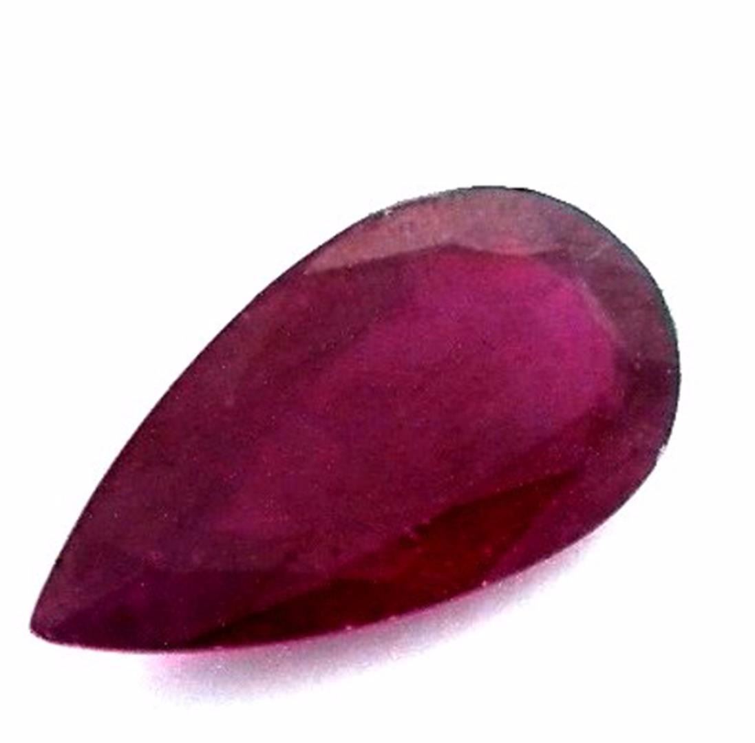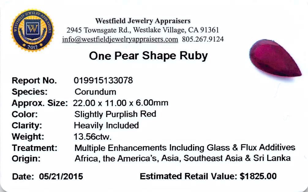 One pear mixed cut natural ruby, measuring 22.00 x 11.00 x 6.00mm, exact weight 13.56ct., clarity is heavily included, type II, medium dark, very slightly brownish, slightly purplish red color, (GIA slpR 6/3), cut is good. Transmitting light somewhat diffusely, transparent to translucent. Naturally occurring internal & external characteristics are present. Indications of laboratory high temperature heat treatment, with glass & flux additives. Ruby has a low tolerance to rhodium plating, repolishing the surface, & ultrasonic cleaning. Westfield Appraised at $1,825.00.