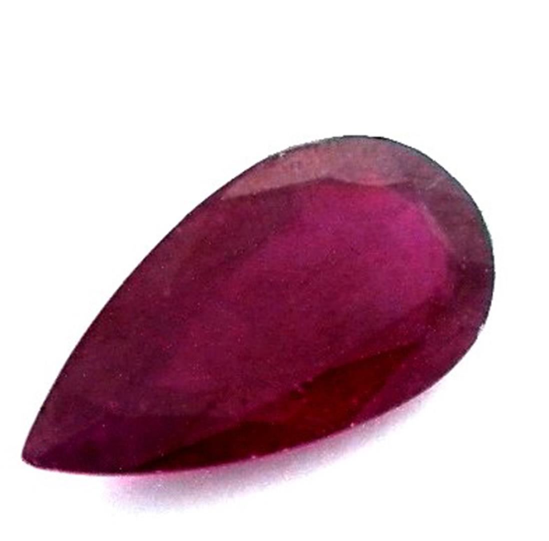 One pear mixed cut natural ruby, measuring 22.00 x 11.00 x 6.00mm, exact weight 13.56ct., clarity is heavily included, type II, medium dark, very slightly brownish, slightly purplish red color, (GIA slpR 6/3), cut is good. Transmitting light somewhat diffusely, transparent to translucent. Naturally occurring internal & external characteristics are present. Indications of laboratory high temperature heat treatment, with glass & flux additives. Ruby has a low tolerance to rhodium plating, repolishing the surface, & ultrasonic cleaning. Westfield Appraised at $1,825.00.