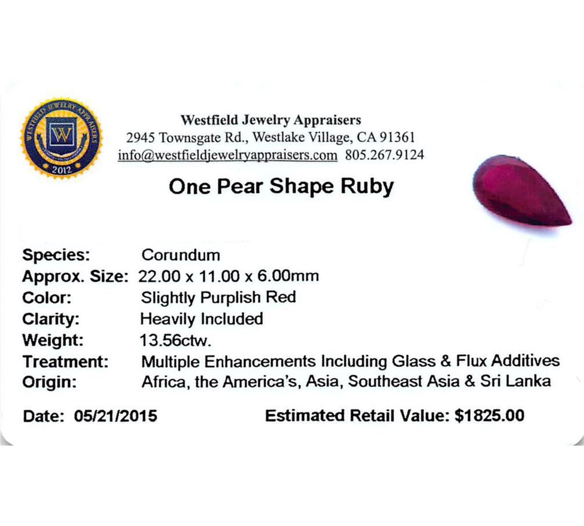 One pear mixed cut natural ruby, measuring 22.00 x 11.00 x 6.00mm, exact weight 13.56ct., clarity is heavily included, type II, medium dark, very slightly brownish, slightly purplish red color, (GIA slpR 6/3), cut is good. Transmitting light somewhat diffusely, transparent to translucent. Naturally occurring internal & external characteristics are present. Indications of laboratory high temperature heat treatment, with glass & flux additives. Ruby has a low tolerance to rhodium plating, repolishing the surface, & ultrasonic cleaning. Westfield Appraised at $1,825.00.