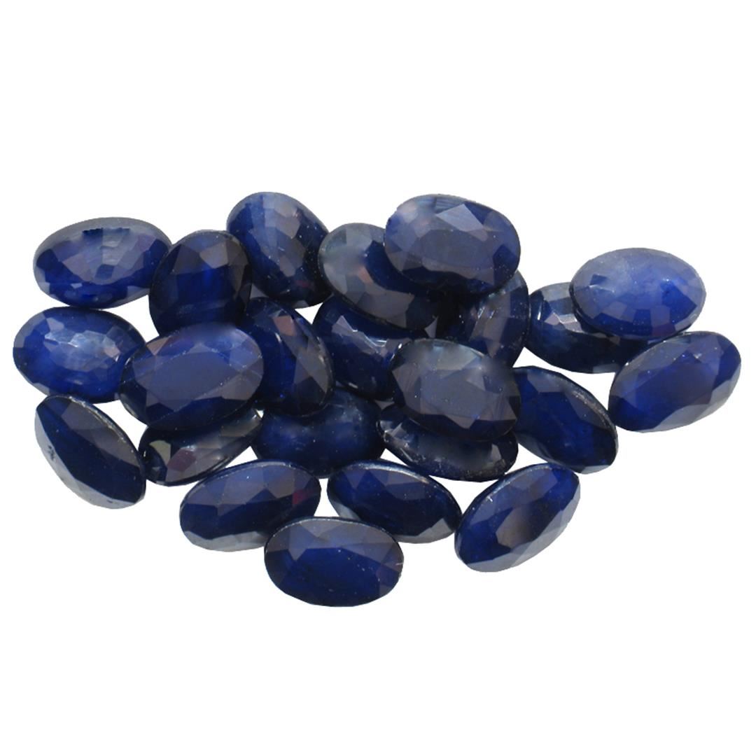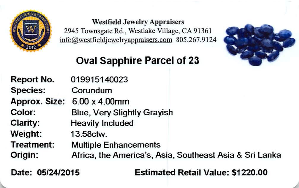 Twenty-three oval mixed cut natural blue sapphires, measuring 5.00 x 3.00 x 1.95mm, exact total weight 13.58ct., clarity is heavily included, type II, dark, very slightly grayish, blue color, (GIA B 7/3), cut is good. Indications of multiple laboratory enhancements, including high temperature heat treatment. Westfield Appraised at $1,220.00.