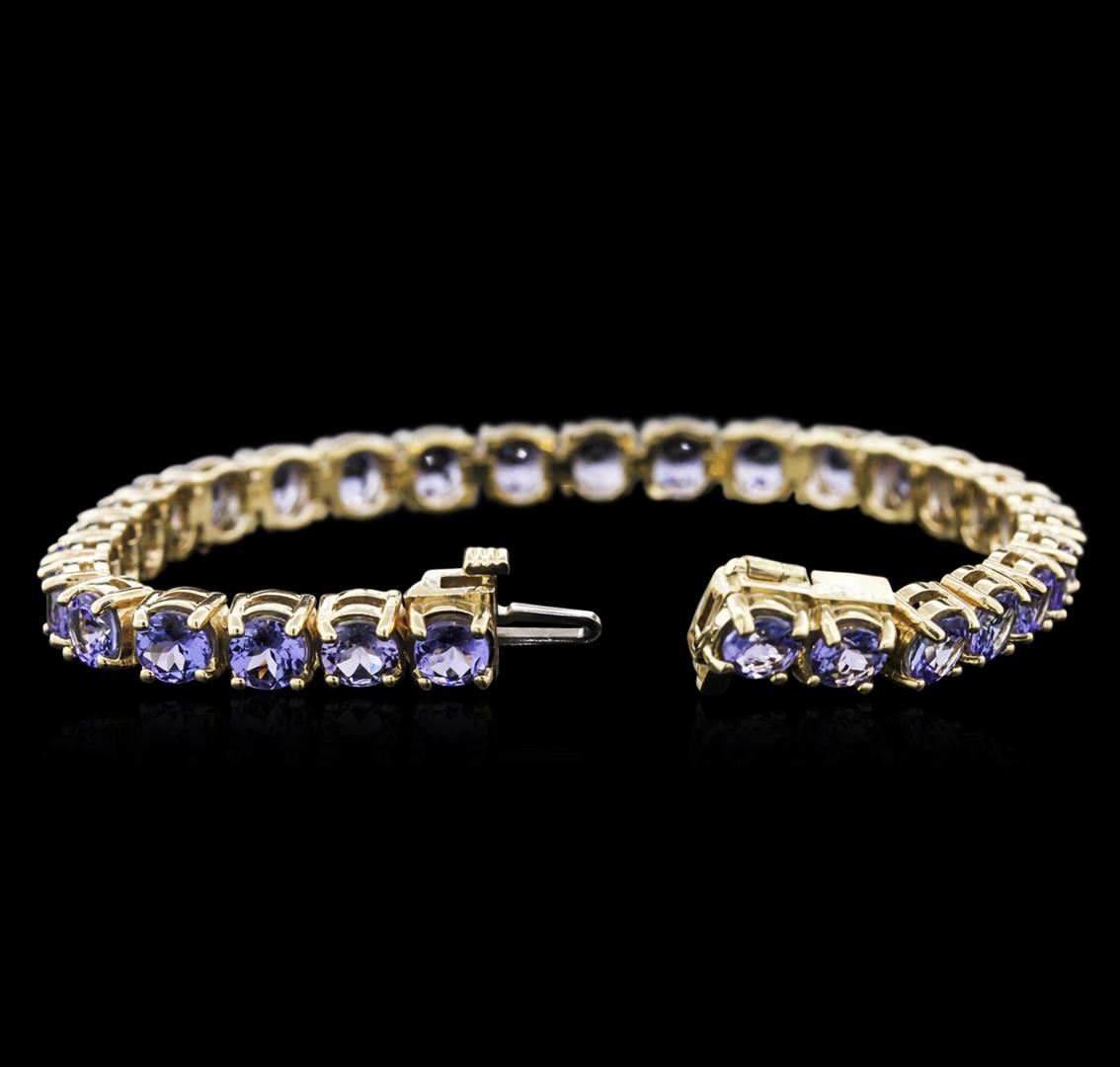 One electronically tested 14KT yellow gold ladies cast tanzanite bracelet with a hidden box clasp with safety closer with a bright polish finish. 7" in length. Identified with markings of "14K". Condition is new. Containing: Thirty-three prong set round modified brilliant cut natural tanzanites, measuring 4.50 - 4.50 x 2.93 mm, approximate. Total Weight of 13.60ct., clarity is eye clean, type I, medium light, very slightly grayish, violet color, (GIA V 4/3), cut is good. Colored gemstones are presumed to have been subjected to commonly used enhancement processes. All colored gemstones are graded in the mounting, unless otherwise stated.Total Weight of Colored Stones 13.60ct. Total Weight of Bracelet 22.96 grams. GGL Appraised at $6,655.00.
