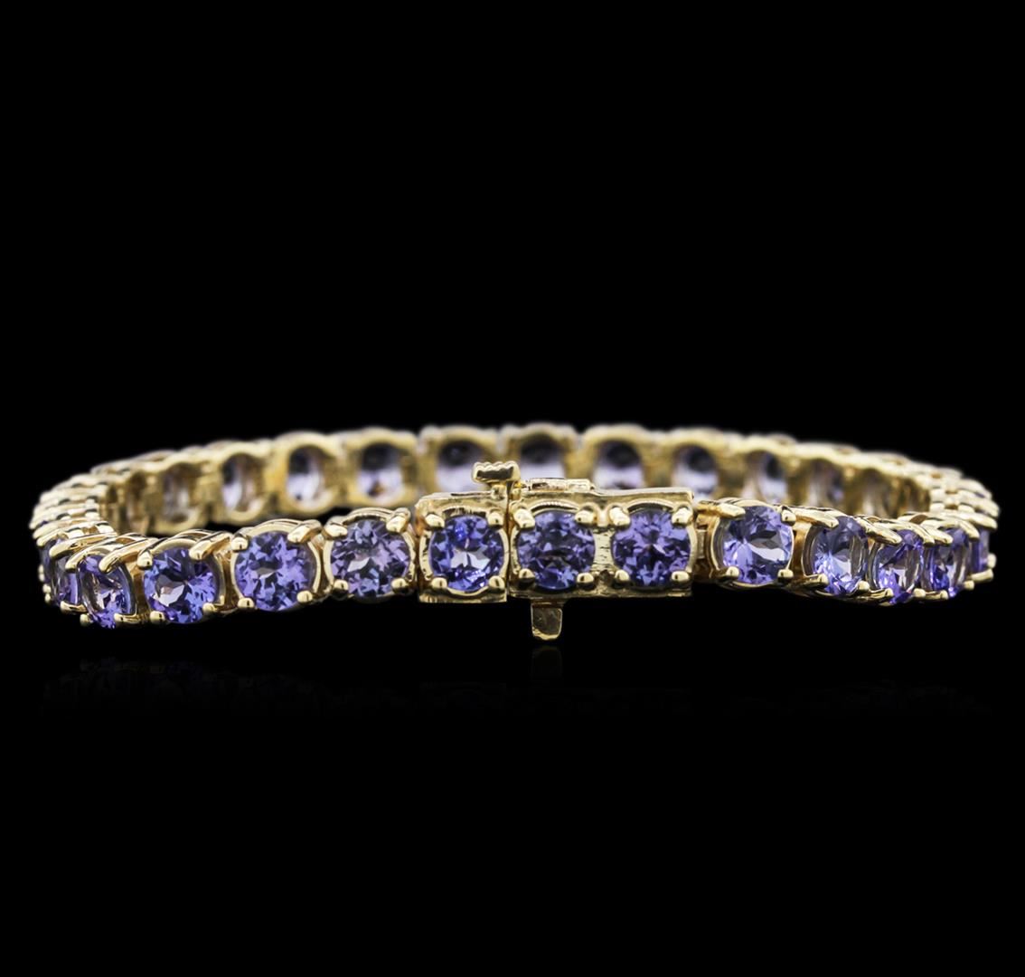 One electronically tested 14KT yellow gold ladies cast tanzanite bracelet with a hidden box clasp with safety closer with a bright polish finish. 7" in length. Identified with markings of "14K". Condition is new. Containing: Thirty-three prong set round modified brilliant cut natural tanzanites, measuring 4.50 - 4.50 x 2.93 mm, approximate. Total Weight of 13.60ct., clarity is eye clean, type I, medium light, very slightly grayish, violet color, (GIA V 4/3), cut is good. Colored gemstones are presumed to have been subjected to commonly used enhancement processes. All colored gemstones are graded in the mounting, unless otherwise stated.Total Weight of Colored Stones 13.60ct. Total Weight of Bracelet 22.96 grams. GGL Appraised at $6,655.00.
