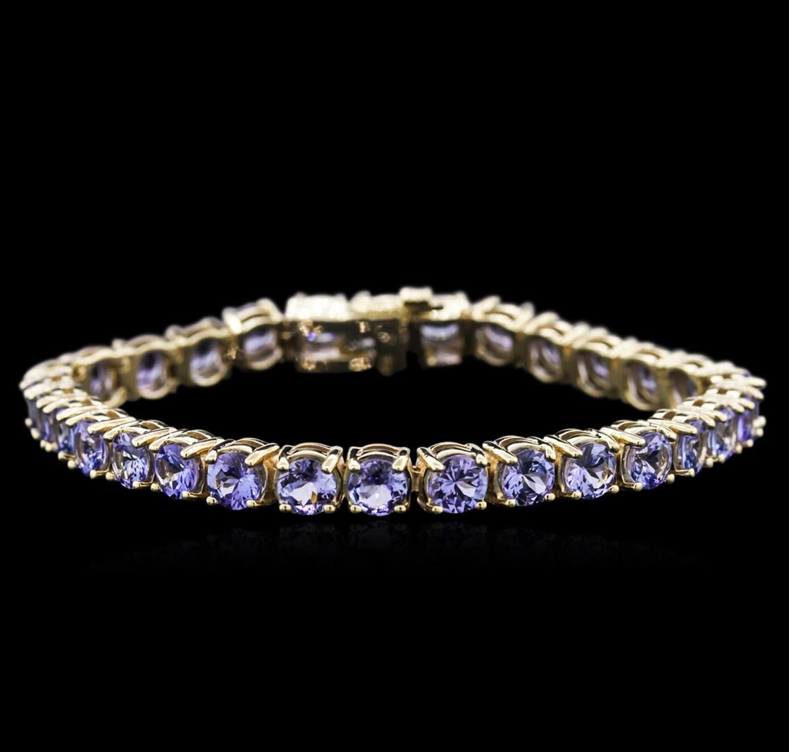 One electronically tested 14KT yellow gold ladies cast tanzanite bracelet with a hidden box clasp with safety closer with a bright polish finish. 7" in length. Identified with markings of "14K". Condition is new. Containing: Thirty-three prong set round modified brilliant cut natural tanzanites, measuring 4.50 - 4.50 x 2.93 mm, approximate. Total Weight of 13.60ct., clarity is eye clean, type I, medium light, very slightly grayish, violet color, (GIA V 4/3), cut is good. Colored gemstones are presumed to have been subjected to commonly used enhancement processes. All colored gemstones are graded in the mounting, unless otherwise stated.Total Weight of Colored Stones 13.60ct. Total Weight of Bracelet 22.96 grams. GGL Appraised at $6,655.00.