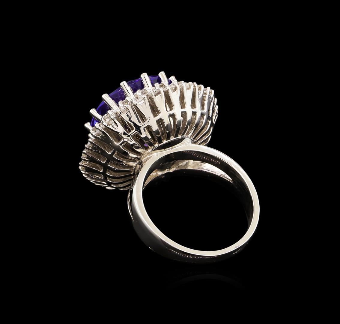 One electronically tested 14KT white gold lady's combination cast & assembled fashion ring with a double basket halo with a bright polish finish. The featured lady's ring has a shank measuring 2.60 millimeters wide. Identified with markings of "K14". Condition is new, good workmanship. Containing: One prong set round modified brilliant cut natural tanzanite, measuring 15.20 - 15.18 x 8.90 mm, approximate weight of 13.60 ct., clarity is eye clean, type I, medium dark, very slightly grayish, blue color, (GIA B 6/3), cut is very good. Transmitting light with no distortion, transparent. Colored gemstones are presumed to have been subjected to commonly used enhancement processes. Graded in the setting. Forty-Four prong set round brilliant cut diamonds, measuring 2.10 - 2.00 x 1.23mm (depth est.) approximate total weight of 44 Stones = 1.36ct. Graded in the setting. Clarity: SI-1 to I-1. Color: G - I. Cut Good. Total Weight of Colored Stones 13.60 ct. Total Weight of Diamonds 1.36ct. Total Weight of Ring 20.40gm. GAS Appraised.
