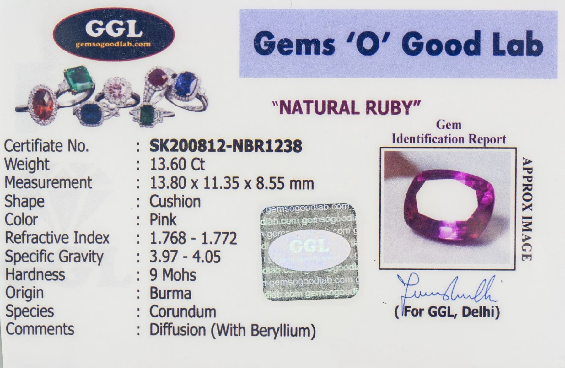 One (1) 13.60 ct cushion cut pink natural ruby. Origin: Burma. Accompanied with GGL certificate. 13.80 x 11.35 x 8.55 mm.