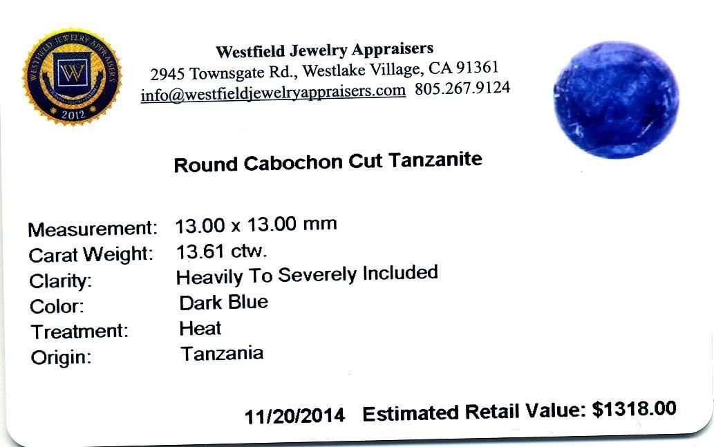 13.61ctw. Round Cabochon Cut Tanzanite. Westfield Appraised at $1,318.00.