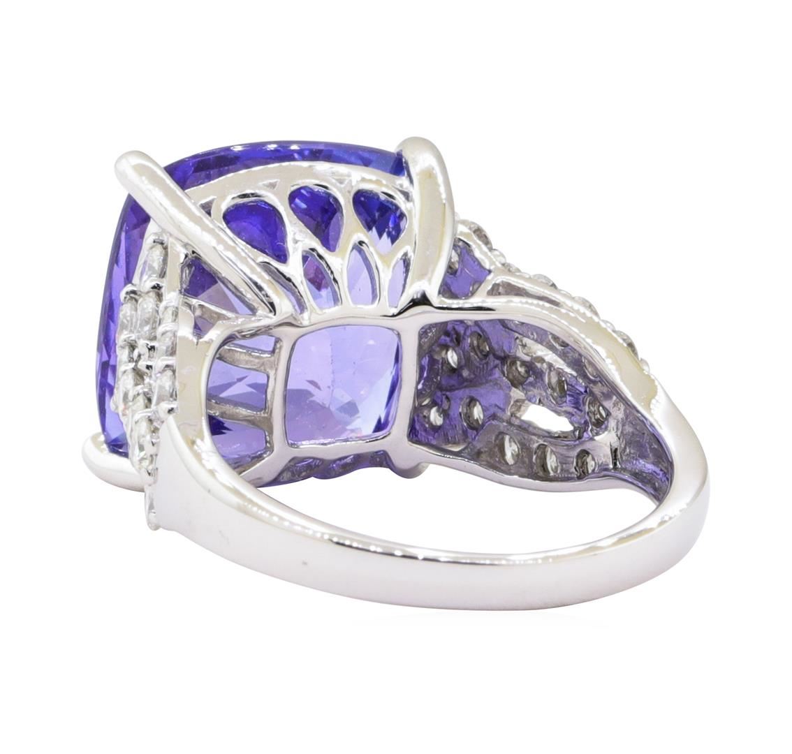 One electronically tested platinum ladies cast tanzanite & diamond ring. The ring features a tanzanite supported by an elaborate lattice under gallery and stylized diamond set tapering shoulders, completed by a two millimeter wide band. Bright polish finish. Trademark is Orianne. Identified with markings of "PT950". Condition is new, good workmanship. Containing: One prong set cushion modified brilliant cut natural tanzanite, measuring 13.37 x 13.31 x 9.91mm, exact weight 13.62ct., clarity is eye clean, type I, medium dark, moderately strong, violet color, (GIA V 6/4), cut is good. Transmitting light with no distortion, transparent. GIA Gemological Report attached. Graded loose prior to setting in the GIA Laboratory, Report #2175570437.Tanzanite is a very rare gemstone that is only found in the country of Tanzania. Originally discovered in 1967. Tiffany & Company, named the stone Tanzanite. It is found in the Usumburu Mountains that border the Umba Valley of northern Tanzania. Tanzanite occurs in gray, brown, violet, blue, reddish-purple, & green. The gem is interesting because of its exceptional pleochroism. Rotated in different directions a tanzanite will exhibit multiple changes of color. Tanzanite has a low tolerance to ultrasonic cleaning, and should not be cleaned using this method. Thirty-Two prong set round brilliant cut diamonds exact total weight 32 Stones = 1.34ct. Graded in the setting. Clarity VS-2 to SI-2 Color F - H Total Weight of Colored Stones 13.62 ct. Total Weight of Diamonds 1.34 ct. Total Weight of Ring 11.30 gm Estimated Retail Value $ 39,970.00 US