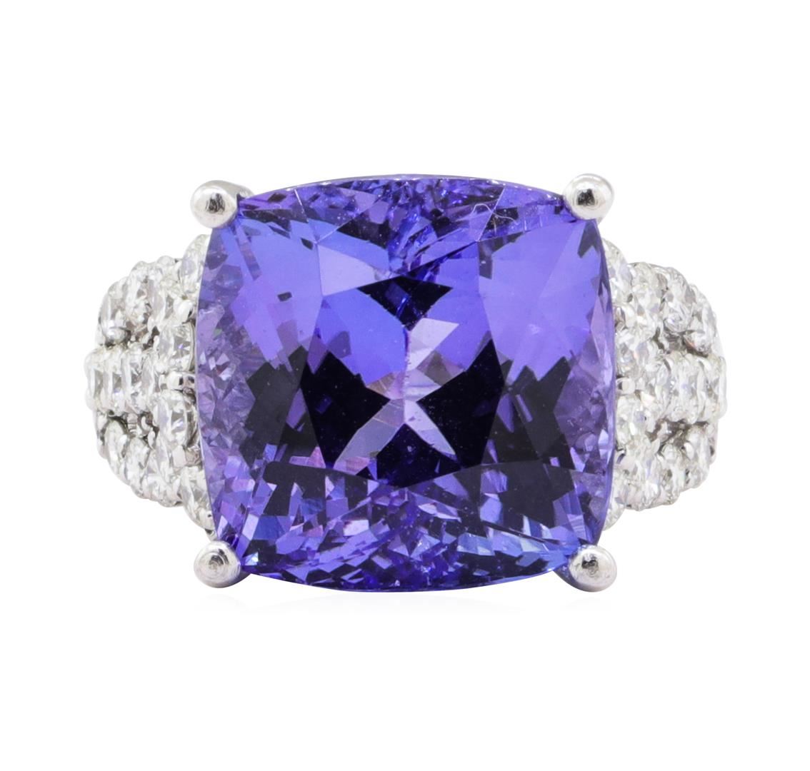 One electronically tested platinum ladies cast tanzanite & diamond ring. The ring features a tanzanite supported by an elaborate lattice under gallery and stylized diamond set tapering shoulders, completed by a two millimeter wide band. Bright polish finish. Trademark is Orianne. Identified with markings of "PT950". Condition is new, good workmanship. Containing: One prong set cushion modified brilliant cut natural tanzanite, measuring 13.37 x 13.31 x 9.91mm, exact weight 13.62ct., clarity is eye clean, type I, medium dark, moderately strong, violet color, (GIA V 6/4), cut is good. Transmitting light with no distortion, transparent. GIA Gemological Report attached. Graded loose prior to setting in the GIA Laboratory, Report #2175570437.Tanzanite is a very rare gemstone that is only found in the country of Tanzania. Originally discovered in 1967. Tiffany & Company, named the stone Tanzanite. It is found in the Usumburu Mountains that border the Umba Valley of northern Tanzania. Tanzanite occurs in gray, brown, violet, blue, reddish-purple, & green. The gem is interesting because of its exceptional pleochroism. Rotated in different directions a tanzanite will exhibit multiple changes of color. Tanzanite has a low tolerance to ultrasonic cleaning, and should not be cleaned using this method. Thirty-Two prong set round brilliant cut diamonds exact total weight 32 Stones = 1.34ct. Graded in the setting. Clarity VS-2 to SI-2 Color F - H Total Weight of Colored Stones 13.62 ct. Total Weight of Diamonds 1.34 ct. Total Weight of Ring 11.30 gm Estimated Retail Value $ 39,970.00 US