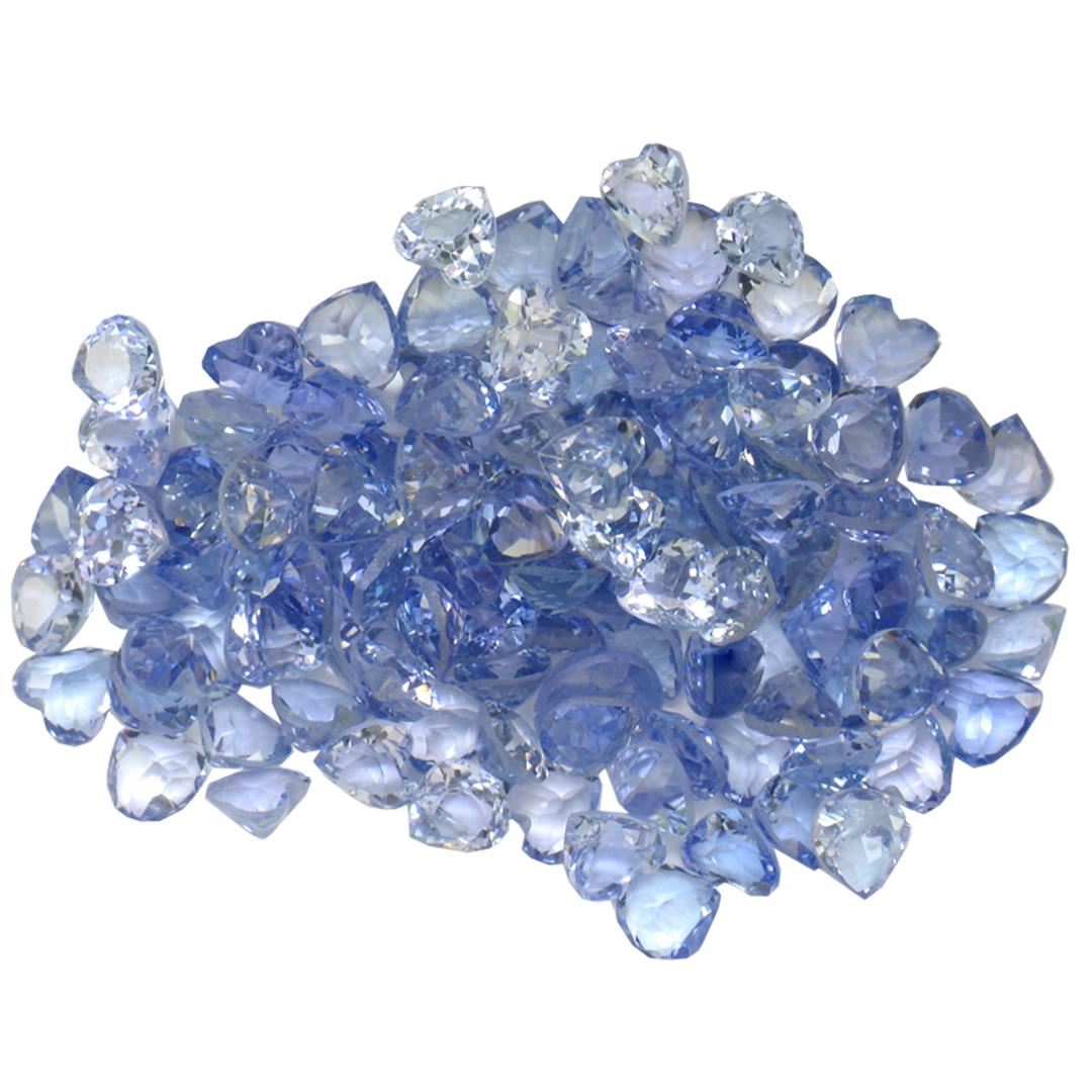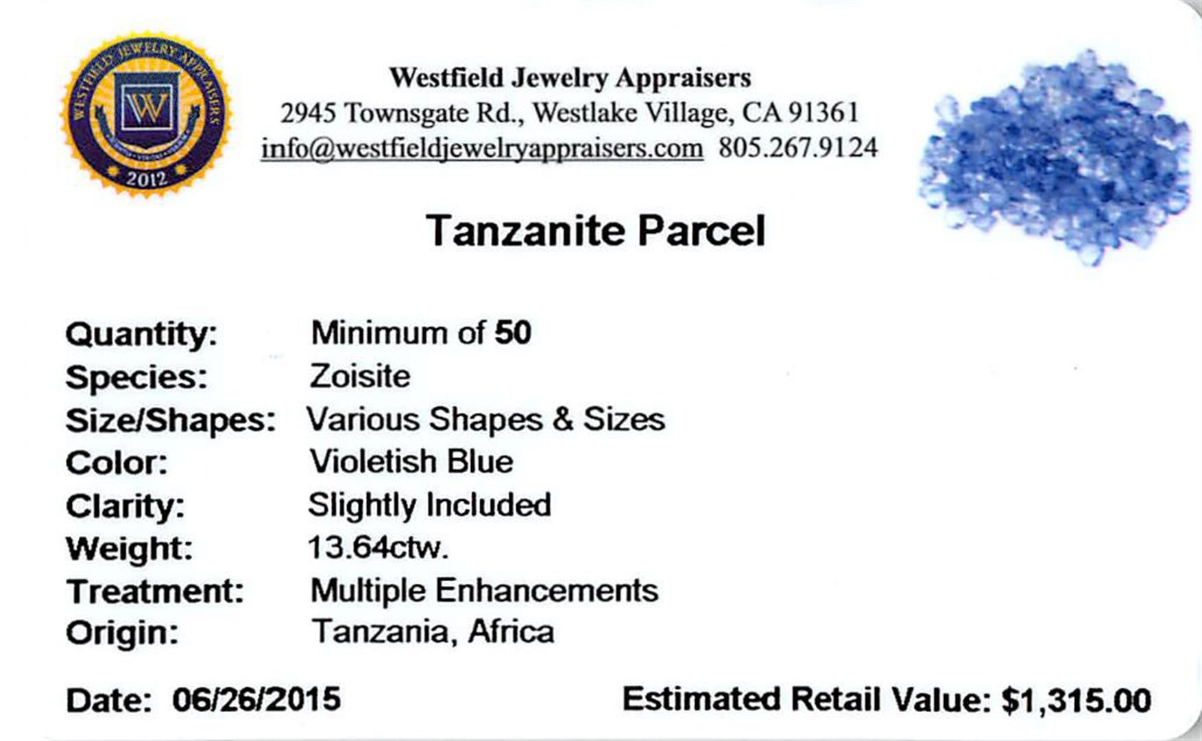 Fifty round mixed cut natural tanzanites, measuring 3.00 - 3.00 x 1.95 mm, exact total weight 13.64ct., clarity is slightly included, type I, medium, very slightly grayish, violetish blue color, (GIA vB 5/3), cut is good. Measurements & the color grade are an average for the group, Color grade is an average for the group, Transmitting light with no distortion, transparent, Naturally occurring internal & external characteristics are present, Indications of multiple laboratory enhancements, including high temperature heat treatment. Westfield Appraised at $1,315.00.