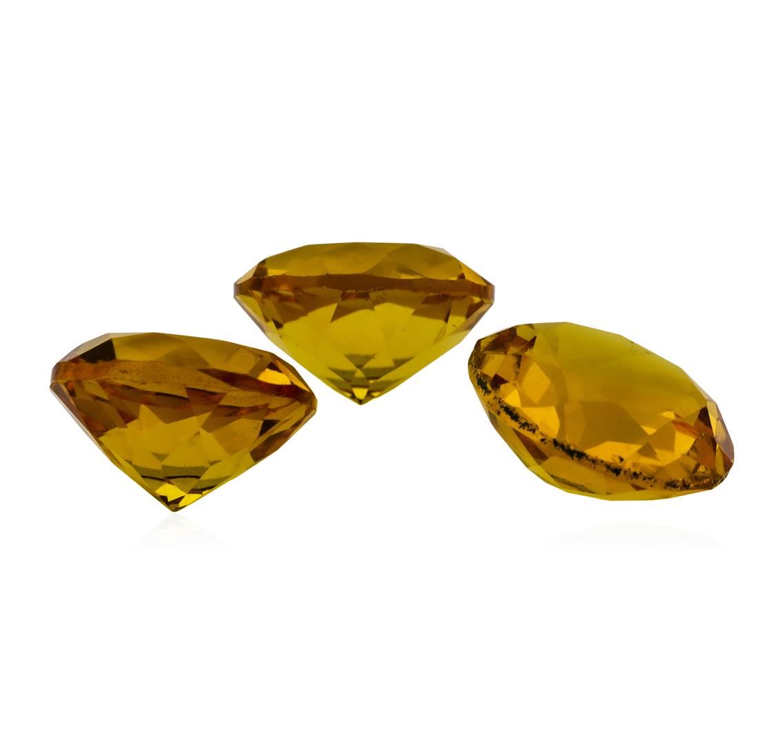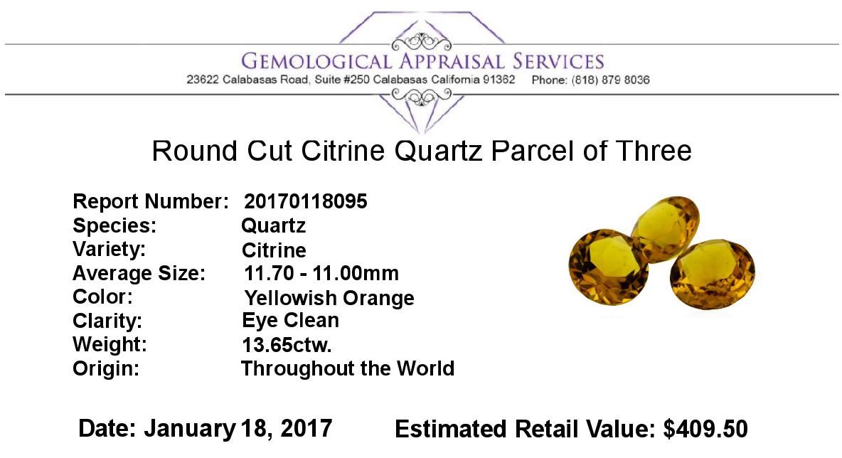 One natural round cut citrine quartz parcel of three with an exact weight of 13.65ctw., clarity is eye clean, yellowish orange. Gemological Appraisals Services estimates the retail value at $409.5 GAS Appraised.