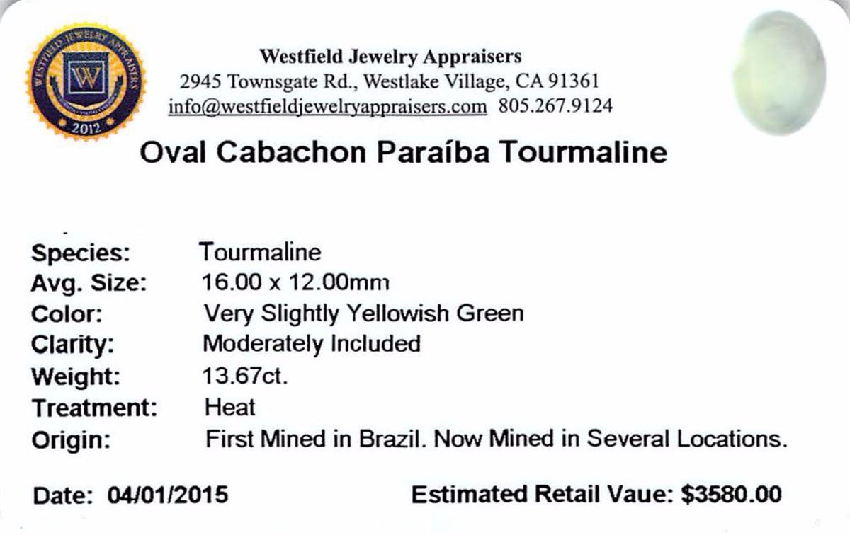 One oval cabochon cut natural Paraiba tourmaline exact weight 13.67ct., clarity is moderately included, cut is good. Westfield Appraised at $3,580.00.
