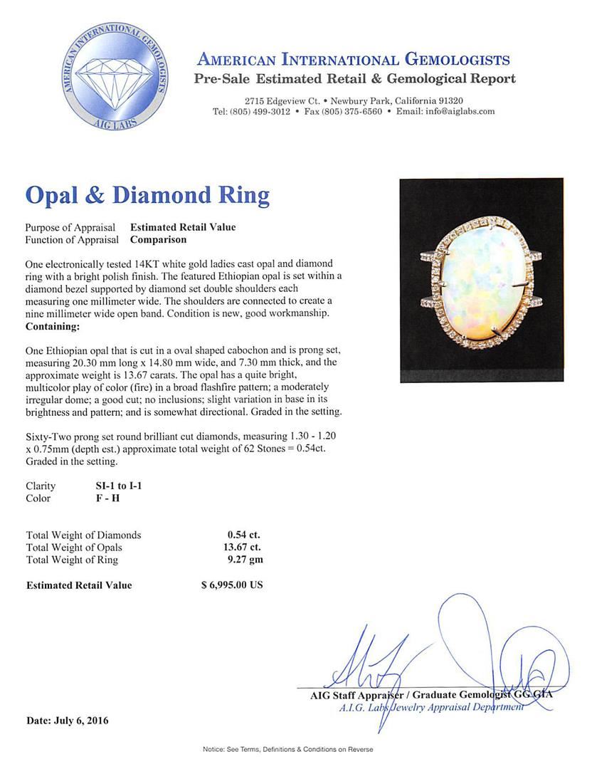 One electronically tested 14KT white gold ladies cast opal and diamond ring with a bright polish finish. The featured Ethiopian opal is set within a diamond bezel supported by diamond set double shoulders each measuring one millimeter wide. The shoulders are connected to create a nine millimeter wide open band. Condition is new, good workmanship. Containing: One semi crystal opal that is cut in a oval shaped cabochon and is prong set, measuring 20.30 mm long x 14.80 mm wide, and 7.30 mm thick and the approximate weight is 13.67 carats. The opal has a quite bright, multicolor play of color (fire) in a broad flashfire pattern; a moderately irregular dome; a good cut; no inclusions; slight variation in base in its brightness and pattern; and is somewhat directional. Graded in the setting. Sixty-Two prong set round brilliant cut diamonds, measuring 1.30 - 1.20 x 0.75mm (depth est.) approximate total weight of 62 Stones = 0.54ct. Graded in the setting. Clarity: SI-1 to I-1. Color: F - H. Total Weight of Diamonds 0.54ct. Total Weight of Opals 13.67ct. Total Weight of Ring 9.27gm. AIG Appraised at $6,995.00.