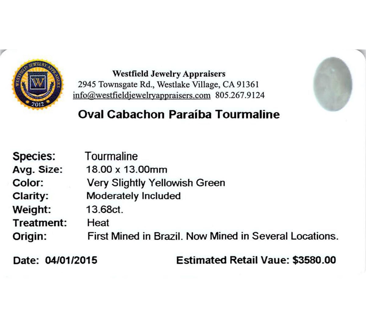 One oval cabochon cut natural Paraiba tourmaline exact weight 13.68ct., clarity is moderately included, cut is good. Westfield Appraised at $3,580.00.