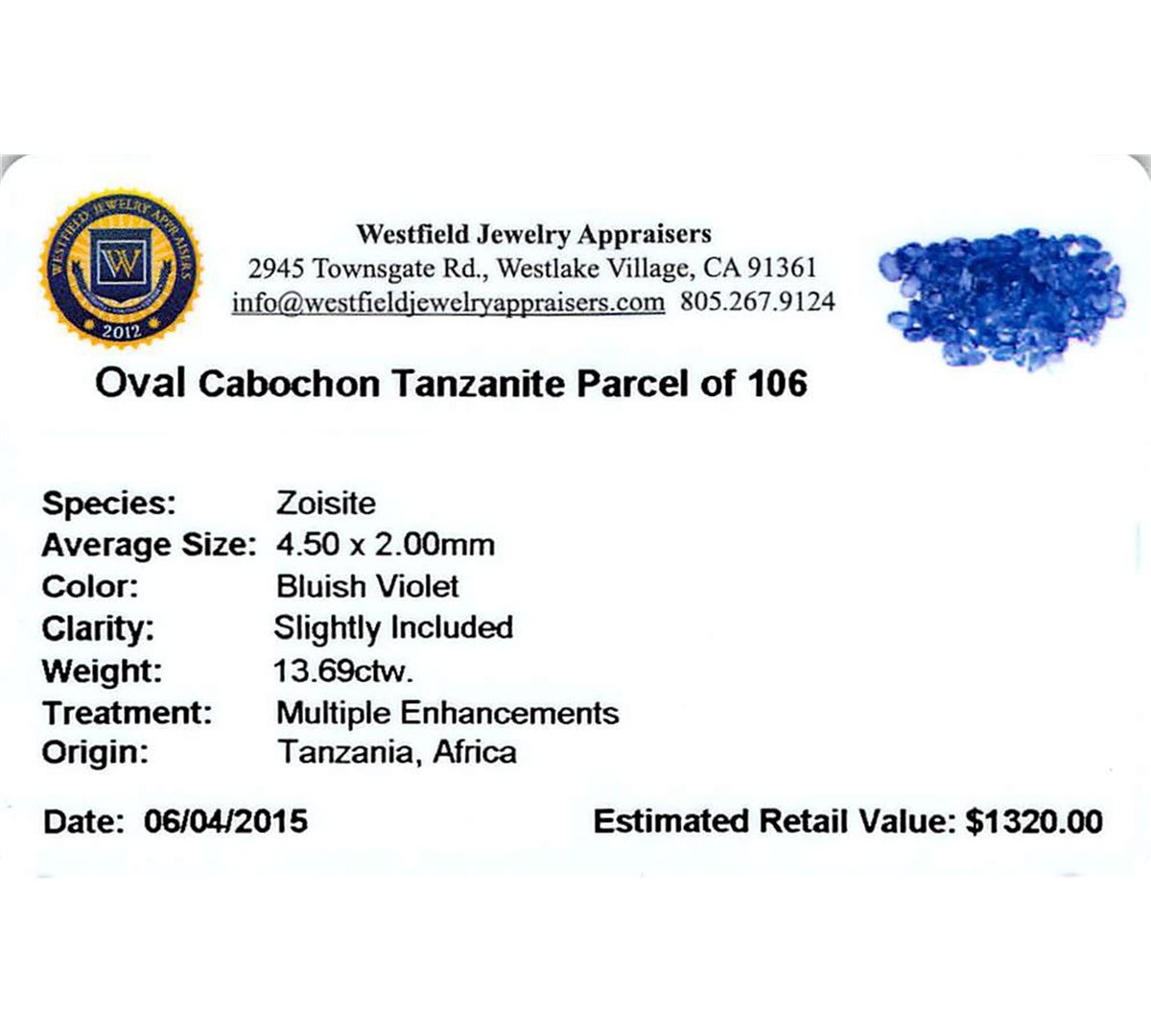 One hundred six oval mixed cut natural tanzanites, measuring 4.50 x 2.00 x 1.30mm, exact total weight 13.69ct., clarity is slightly included, type I, medium, very slightly grayish, bluish violet color, (GIA bV 5/3), cut is good. Transmitting light with a minimum of distortion, transparent, Naturally occurring internal & external characteristics are present. Measurements & the color grade are an average for the group. Tanzanite is a very rare gemstone that is only found in the country of Tanzania. Originally discovered in 1967. Tiffany & Company, named the stone Tanzanite. It is found in the Usumburu Mountains that border the Umba Valley of northern Tanzania. Tanzanite occurs in gray, brown, violet, blue, reddish-purple, & green. The gem is interesting because of its exceptional pleochroism. Rotated in different directions a tanzanite will exhibit multiple changes of color. Tanzanite has a low tolerance to ultrasonic cleaning, and should not be cleaned using this method. Westfield Appraised at $1,320.00.