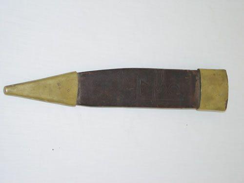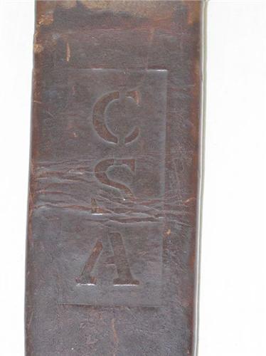 13 7/8" CONFEDERATE CIVIL WAR BOWIE KNIFE SCABBARD- LEATHER W/ BRASS FITTINGS, STAMPED IN LEATHER "CSA" - REMINANTS OF RED FELT LINER, NORMAL WEAR & IMPERFECTIONS, OVERALL VERY GOOD