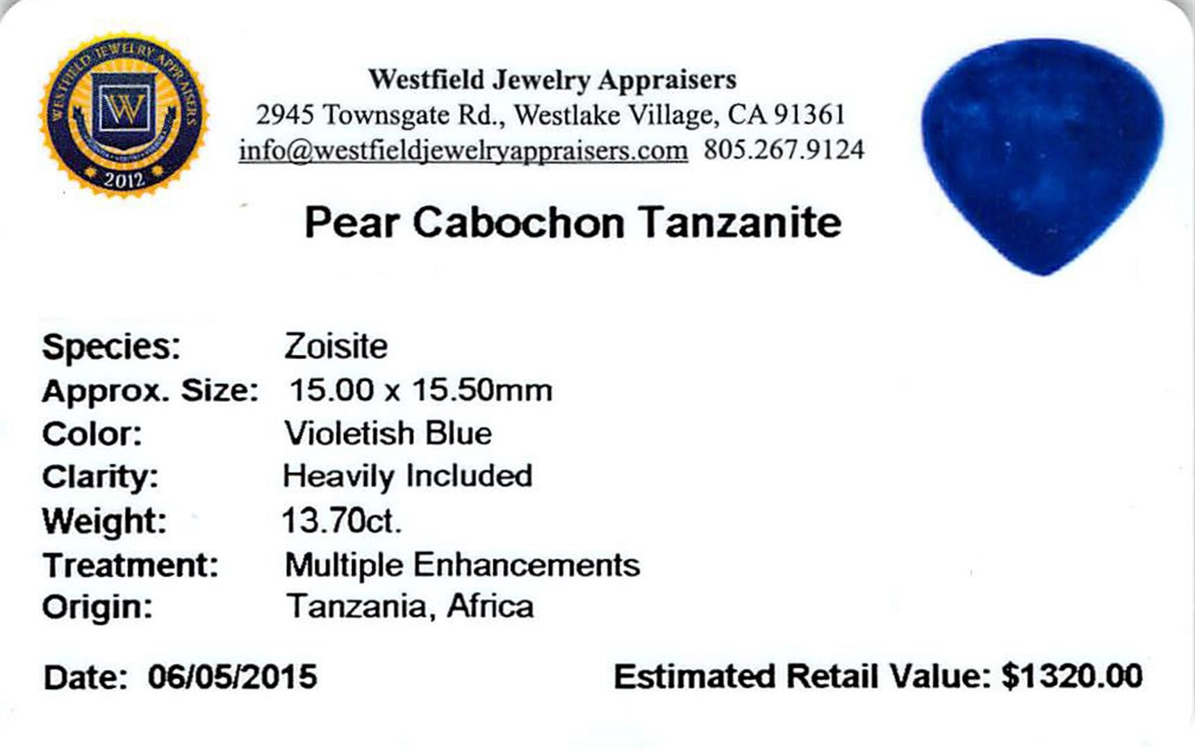 One pear cabochon cut natural tanzanite, measuring 15.00 x 15.50 x 7.00mm, exact weight 13.70ct., clarity is heavily included, type I, dark, moderately strong, violetish blue color, (GIA vB 7/4), cut is good. Transmitting light somewhat diffusely, transparent to translucent. Naturally occurring internal & external characteristics are present. Tanzanite is a very rare gemstone that is only found in the country of Tanzania. Originally discovered in 1967. Tiffany & Company, named the stone Tanzanite. It is found in the Usumburu Mountains that border the Umba Valley of northern Tanzania. Tanzanite occurs in gray, brown, violet, blue, reddish-purple, & green. The gem is interesting because of its exceptional pleochroism. Rotated in different directions a tanzanite will exhibit multiple changes of color. Tanzanite has a low tolerance to ultrasonic cleaning, and should not be cleaned using this method. Westfield Appraised at $1,320.00.