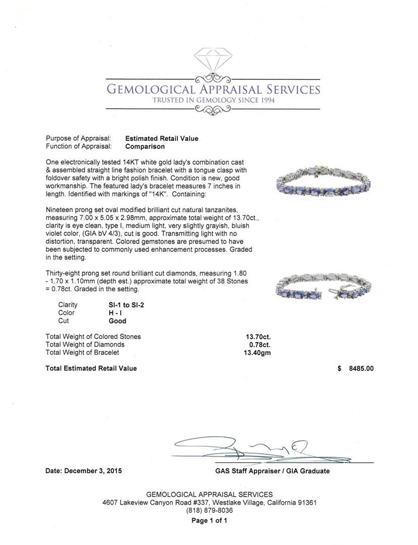 One electronically tested 14KT white gold lady's combination cast & assembled straight line fashion bracelet with a tongue clasp with foldover safety with a bright polish finish. The featured lady's bracelet measures 7 inches in length. Identified with markings of "14K". Condition is new, good workmanship. Containing: Nineteen prong set oval modified brilliant cut natural tanzanites, measuring 7.00 x 5.05 x 2.98mm, approximate total weight of 13.70ct., clarity is eye clean, type I, medium light, very slightly grayish, bluish violet color, (GIA bV 4/3), cut is good. Transmitting light with no distortion, transparent. Colored gemstones are presumed to have been subjected to commonly used enhancement processes. Graded in the setting. Thirty-Eight prong set round brilliant cut diamonds, measuring 1.80 - 1.70 x 1.10mm (depth est.) approximate total weight of 38 Stones = 0.78ct. Graded in the setting. Clarity: SI-1 to SI-2. Color: H - I. Cut Good. Total Weight of Colored Stones 13.70ct. Total Weight of Diamonds 0.78ct. Total Weight of Bracelet 13.40gm. GAS Appraised.