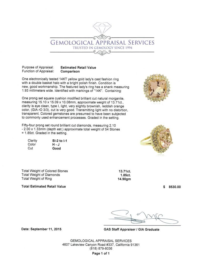 One electronically tested 14KT yellow gold lady's cast fashion ring with a double basket halo with a bright polish finish. The featured lady's ring has a shank measuring 1.93 millimeters wide. Identified with markings of "14K". Condition is new, good workmanship. Containing: One prong set square cushion modified brilliant cut natural morganite, measuring 15.10 x 15.09 x 10.08mm, approximate weight of 13.71ct., clarity is eye clean, type I, light, very slightly brownish, reddish orange color, (GIA rO 3/3), cut is very good. Transmitting light with no distortion, transparent. Colored gemstones are presumed to have been subjected to commonly used enhancement processes. Graded in the setting. Fifty-Four prong set round brilliant cut diamonds, measuring 2.10 - 2.00 x 1.33mm (depth est.) approximate total weight of 54 Stones = 1.85ct. Graded in the setting. Clarity: SI-2 to I-1. Color: H - Good. Total Weight of Colored Stones 13.71ct. Total Weight of Diamonds 1.85ct. Total Weight of Ring 14.90gm. GAS Appraised at $8,530.00.