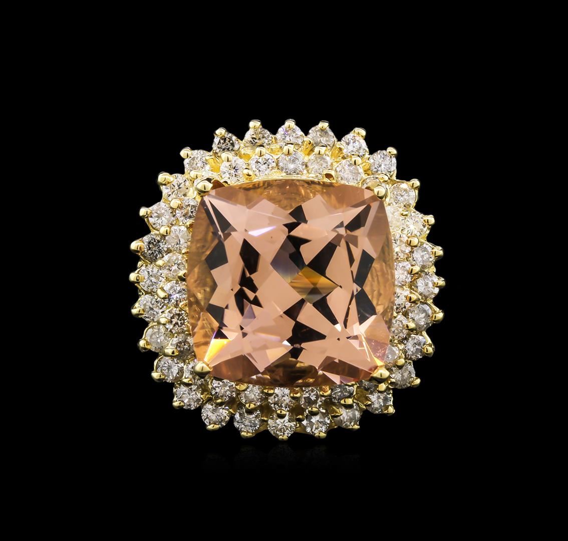 One electronically tested 14KT yellow gold lady's cast fashion ring with a double basket halo with a bright polish finish. The featured lady's ring has a shank measuring 1.93 millimeters wide. Identified with markings of "14K". Condition is new, good workmanship. Containing: One prong set square cushion modified brilliant cut natural morganite, measuring 15.10 x 15.09 x 10.08mm, approximate weight of 13.71ct., clarity is eye clean, type I, light, very slightly brownish, reddish orange color, (GIA rO 3/3), cut is very good. Transmitting light with no distortion, transparent. Colored gemstones are presumed to have been subjected to commonly used enhancement processes. Graded in the setting. Fifty-Four prong set round brilliant cut diamonds, measuring 2.10 - 2.00 x 1.33mm (depth est.) approximate total weight of 54 Stones = 1.85ct. Graded in the setting. Clarity: SI-2 to I-1. Color: H - Good. Total Weight of Colored Stones 13.71ct. Total Weight of Diamonds 1.85ct. Total Weight of Ring 14.90gm. GAS Appraised at $8,530.00.
