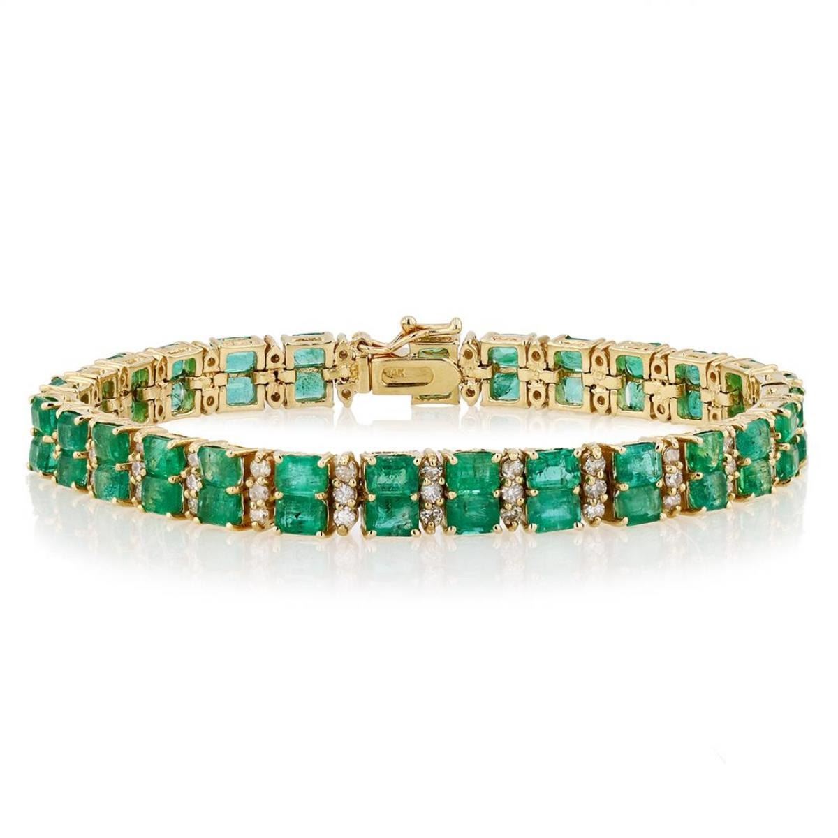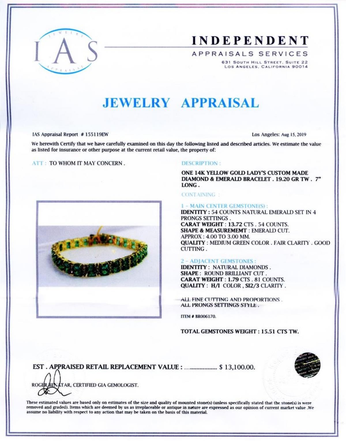DESCRIPTION ONE 14K YELLOW GOLD LADY'S CUSTOM MADE DIAMOND AND EMERALD BRACELET. 19.20 GR TW. 7" LONG. CONTAIING 1- MAIN CENTER GEMSTONE(S): IDENTITY: 54 COUNTS NATURAL EMERALD SET IN 4 PRONGS SETTINGS. CARAT WEIGHT: 13.72 CTS. 54 COUNTS. SHAPE AND MEASUREMEMT: EMERALD CUT. APPROX: 4.00 TO 3.00 MM. QUALITY: MEDIUM GREEN COLOR. FAIR CLARITY. GOOD CUTTING. 2- ADJACENT GEMSTONES: IDENTITY: NATURAL DIAMONDS. SHAPE: ROUND BRILLIANT CUT. CARAT WEIGHT: 1.79 CTS. 81 COUNTS. QUALITY: H-I COLOR, SI-2/3 CLARITY . ALL FINE CUTTING AND PROPORTIONS ALL PRONGS SETTINGS STYLE. TOTAL GEMSTONES WEIGHT: 15.51 CTS TW.