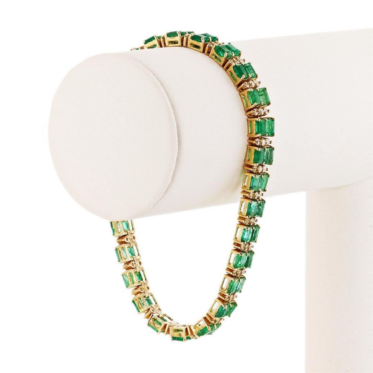 DESCRIPTION ONE 14K YELLOW GOLD LADY'S CUSTOM MADE DIAMOND AND EMERALD BRACELET. 19.20 GR TW. 7" LONG. CONTAIING 1- MAIN CENTER GEMSTONE(S): IDENTITY: 54 COUNTS NATURAL EMERALD SET IN 4 PRONGS SETTINGS. CARAT WEIGHT: 13.72 CTS. 54 COUNTS. SHAPE AND MEASUREMEMT: EMERALD CUT. APPROX: 4.00 TO 3.00 MM. QUALITY: MEDIUM GREEN COLOR. FAIR CLARITY. GOOD CUTTING. 2- ADJACENT GEMSTONES: IDENTITY: NATURAL DIAMONDS. SHAPE: ROUND BRILLIANT CUT. CARAT WEIGHT: 1.79 CTS. 81 COUNTS. QUALITY: H-I COLOR, SI-2/3 CLARITY . ALL FINE CUTTING AND PROPORTIONS ALL PRONGS SETTINGS STYLE. TOTAL GEMSTONES WEIGHT: 15.51 CTS TW.